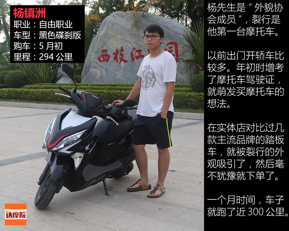 以前出門開轎車比較多。年初時增考了摩托車駕駛證,就萌發(fā)了買摩托車的想法。在實體店對比過幾款主流品牌的踏板車,就被裂行的外觀吸引了,然后毫不猶豫就下單了。
