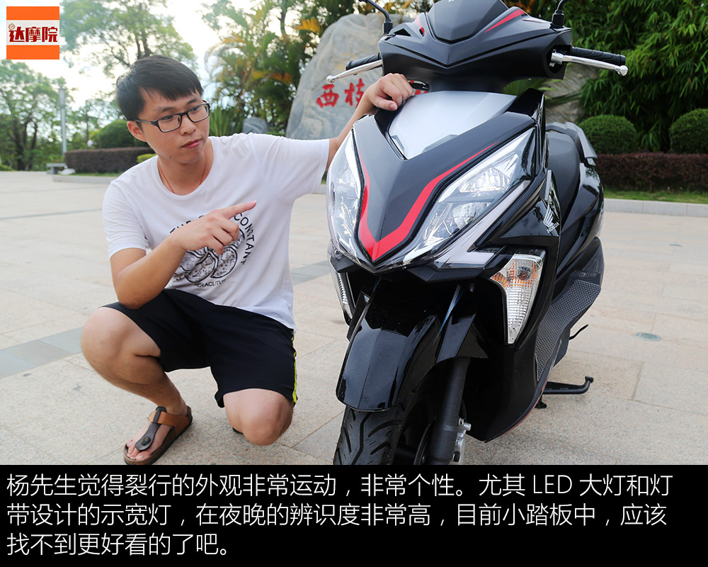 楊先生覺得裂行的外觀非常運動,非常個性。尤其LED大燈和燈帶設計的示寬燈,在夜晚的辨識度非常高,目前小踏板中,應該找不到更好看的了吧。