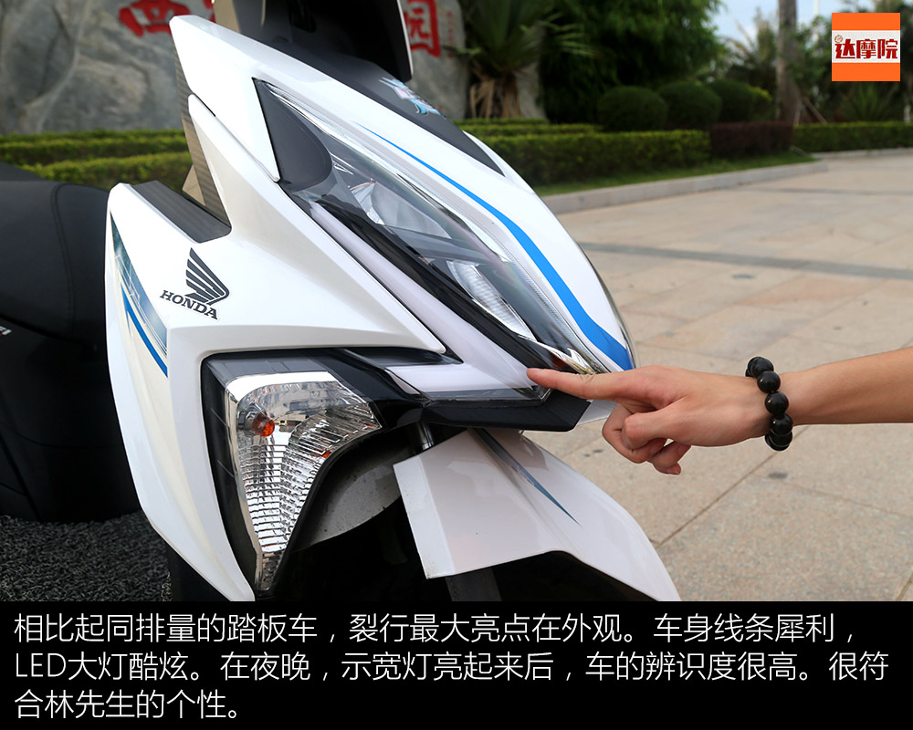 相比起同排量的踏板車,裂行最大亮點在外觀。車身線條犀利,LED大燈酷炫。在夜晚,示寬燈亮起來后,車的辨識度很高。很符合自己的個性。