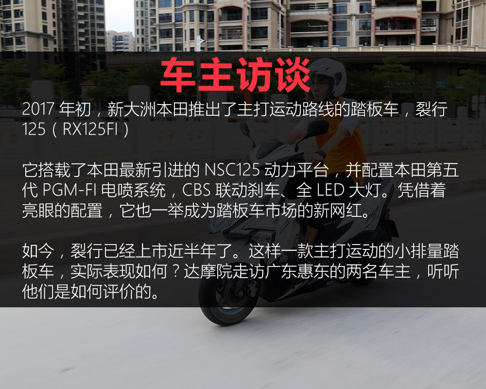 核心提示:車主訪談2017年初,新大洲本田推出了主打運動路線的踏板車,裂行125(RX125FI)它搭載了本田最新引進的NSC125動力平臺,并配置本
