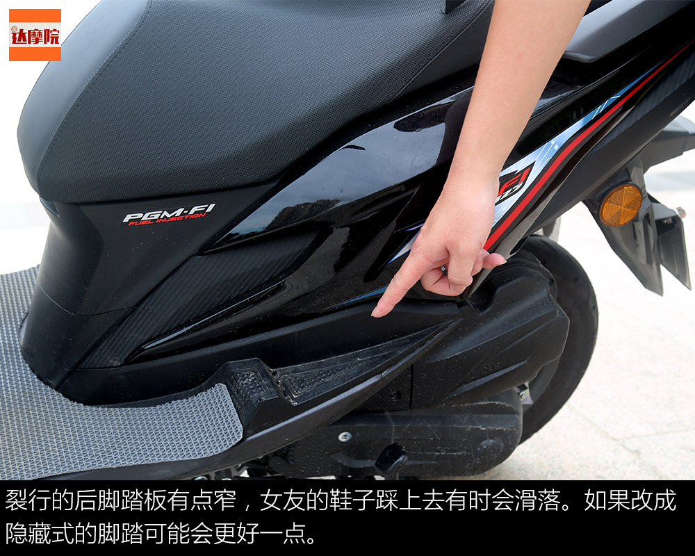 裂行的后腳踏板有點窄,女友的鞋子踩上去有時候會滑落。如果改成隱藏式的腳踏可能會更好一點。