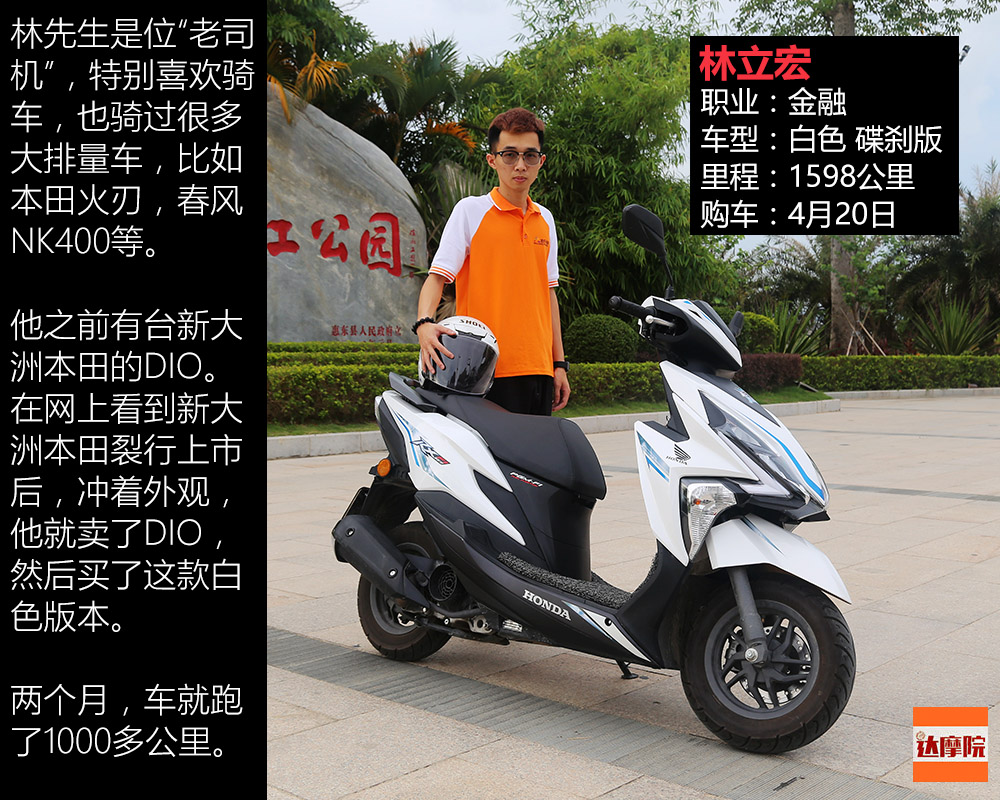 他之前有臺新大洲本田的DIO。在網(wǎng)上看到新大洲本田裂行上市后,沖著外觀,他就賣了DIO,然后買了這款白色版本的裂行。