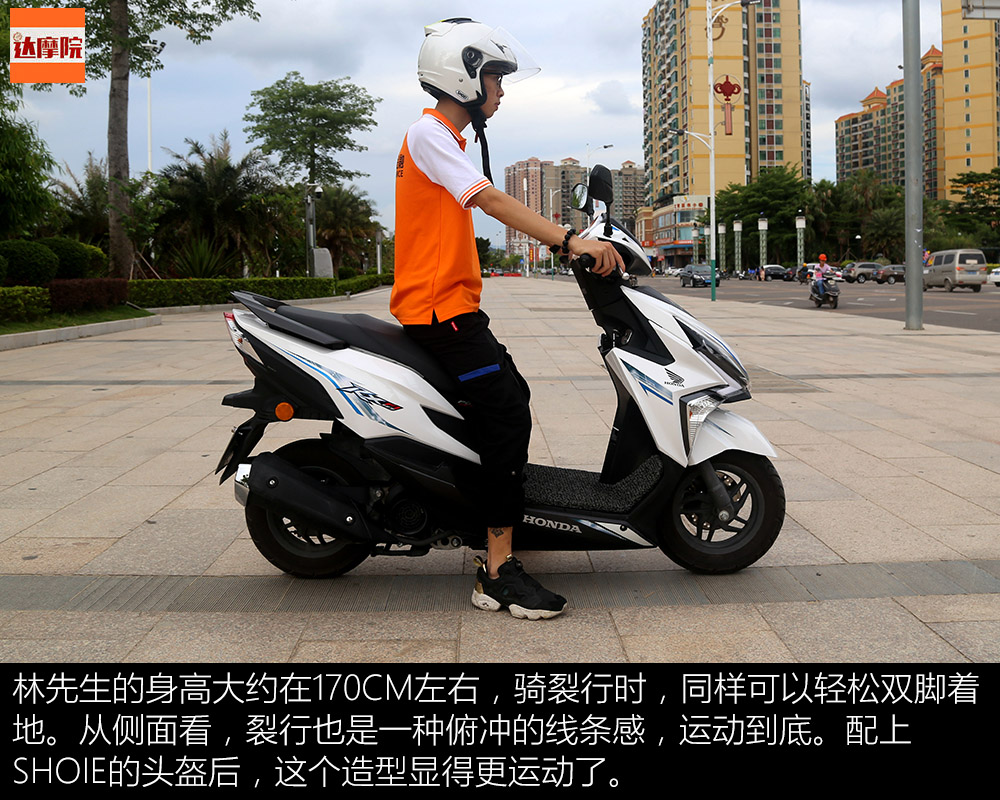 林先生的身高大約在170CM左右,騎裂行時,同樣可以輕松雙腳著地。從側(cè)面看,裂行也是一種俯沖的線條感,運動到底。配上SHOIE的頭盔后,這個造型顯得更運動了。