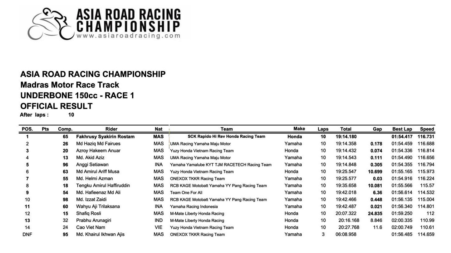 最終,駕駛 65 號賽車(Honda)的馬來西亞車手 F.S Rostam 以 0.178 秒的優(yōu)勢奪得了冠軍,這是他在今年賽季里的第三次冠軍。前五名沖線的車手,第一到第五名的時間相差不到 0.8 秒,另外的兩位馬來西亞車手 Md Haziq Md Fairues(Yamaha)、A.H.Anuar(Honda) 分別獲得了第二、第三。經(jīng)過了季初到現(xiàn)在的調(diào)整,Honda 的賽車似乎開始發(fā)力,Yamaha 在此級別的優(yōu)勢正被一點一點地追趕著。