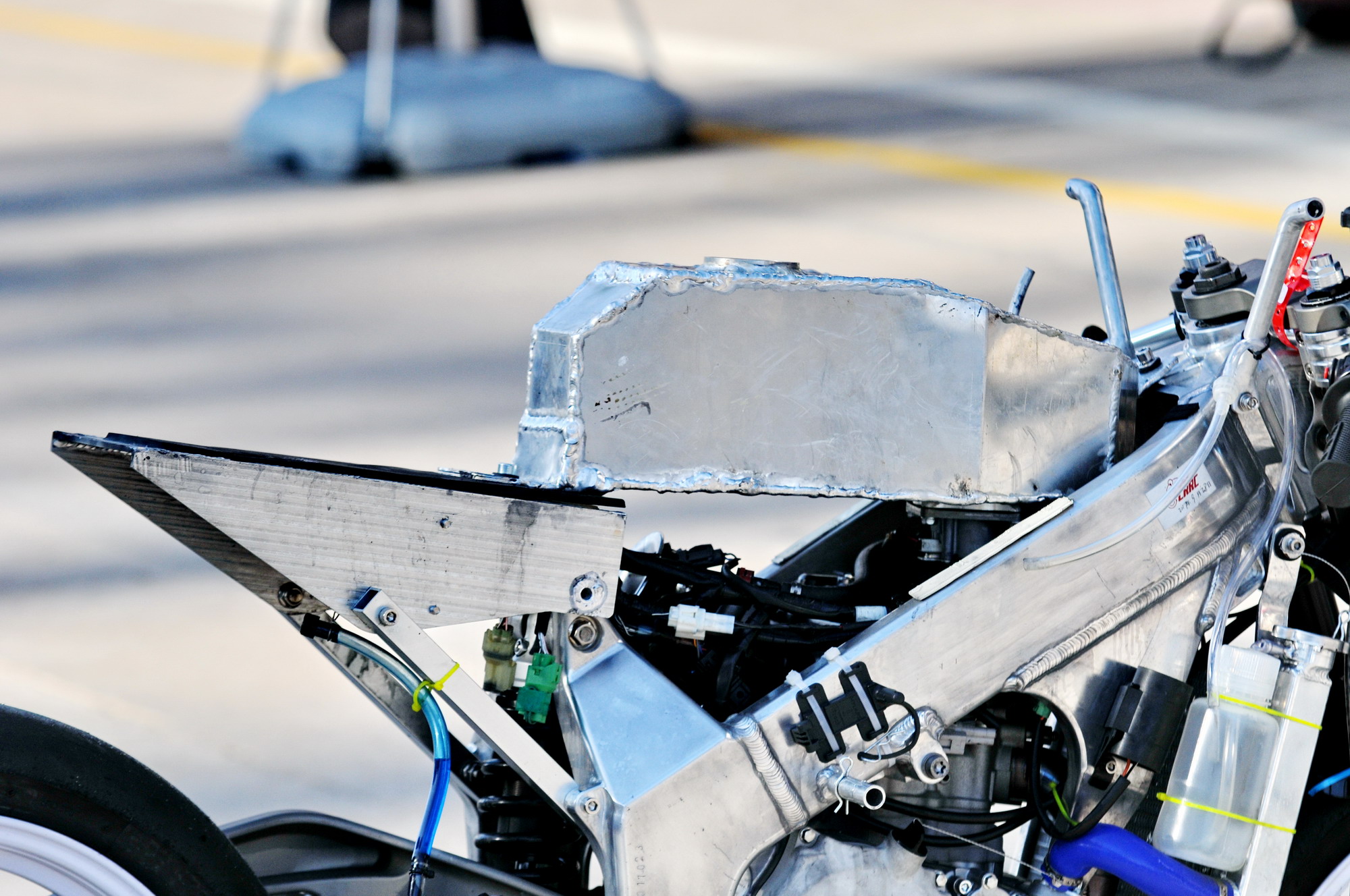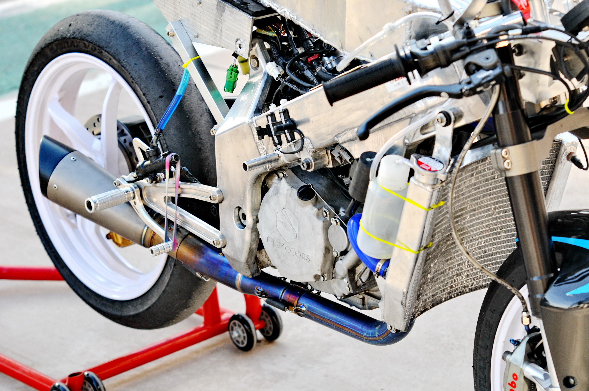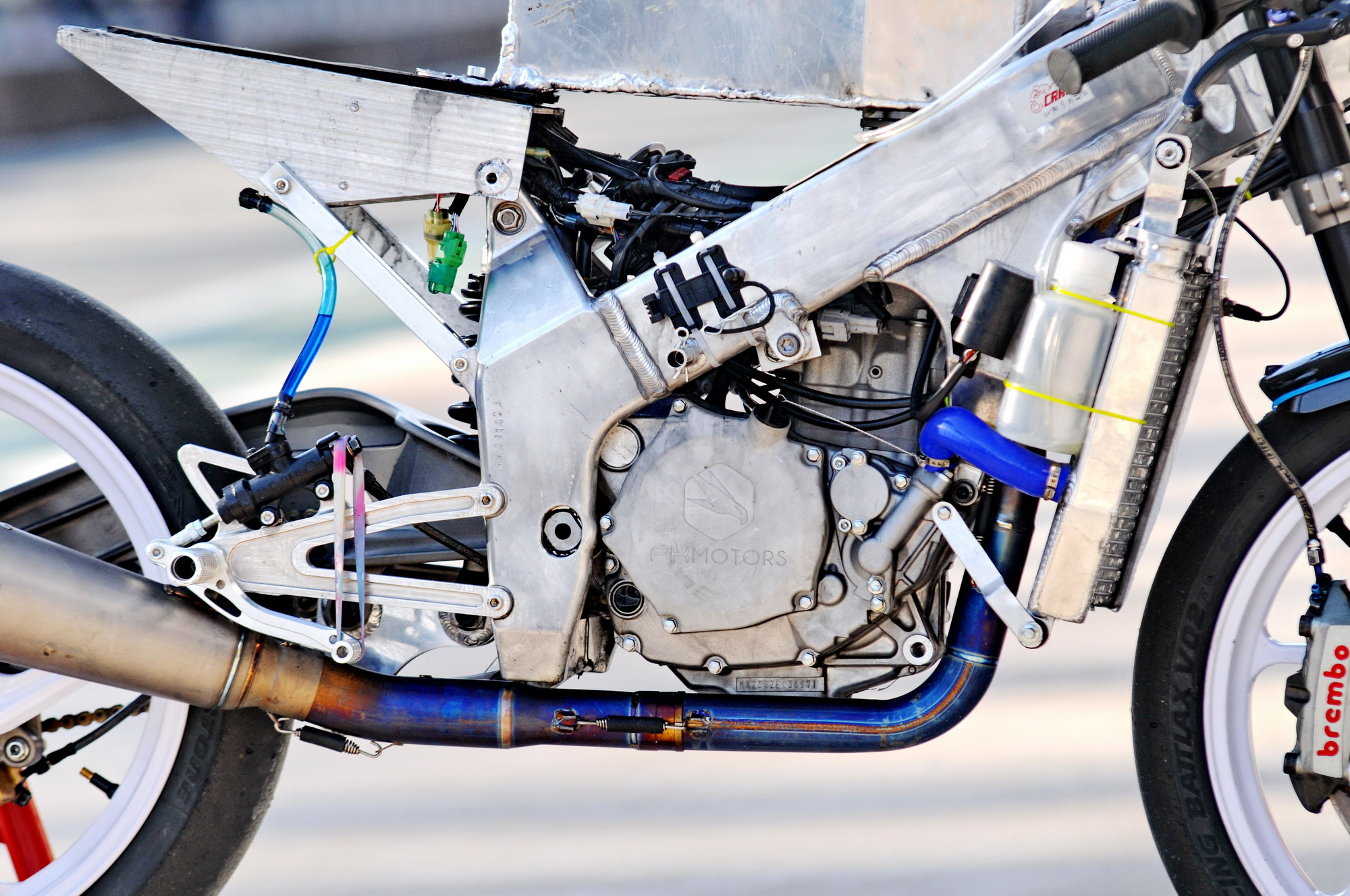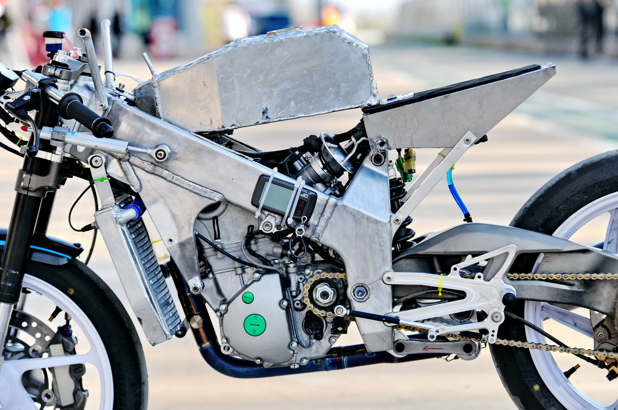這部搭載單汽缸發(fā)動(dòng)機(jī)的賽車(chē),采用一副粗壯的鋁合金車(chē)架、后單搖臂的設(shè)計(jì),前懸掛、制動(dòng)系統(tǒng)都是一般量產(chǎn)車(chē)所難以采用的高配置。