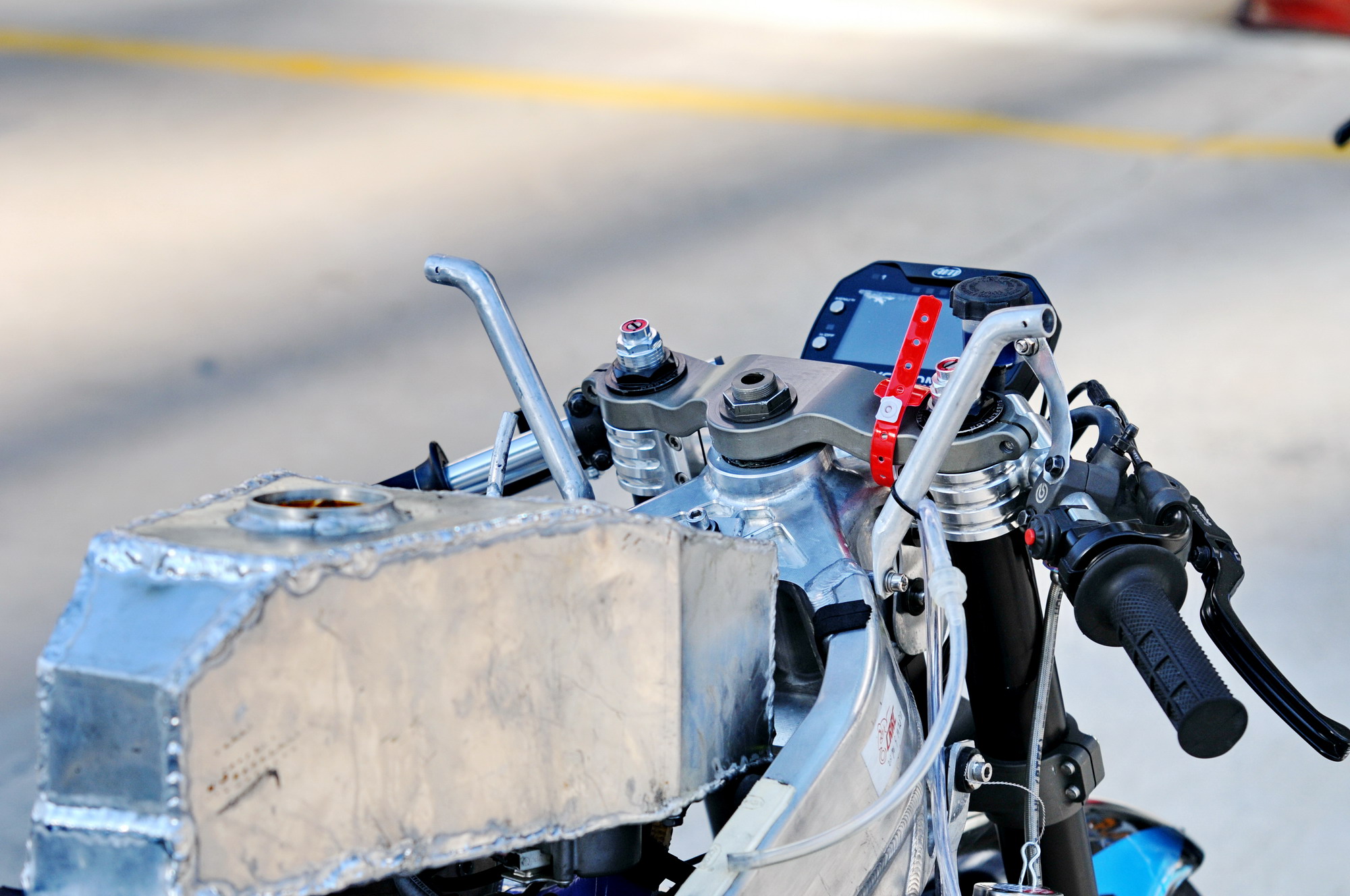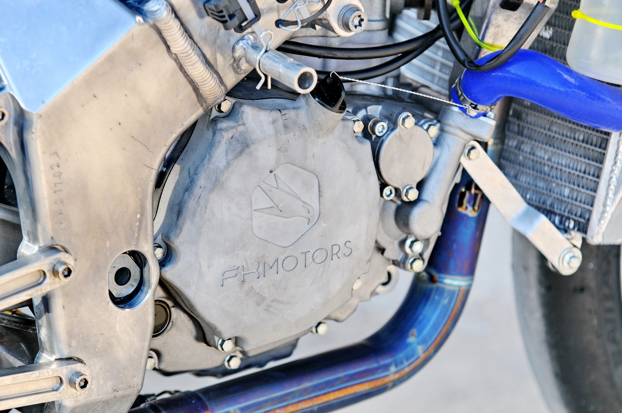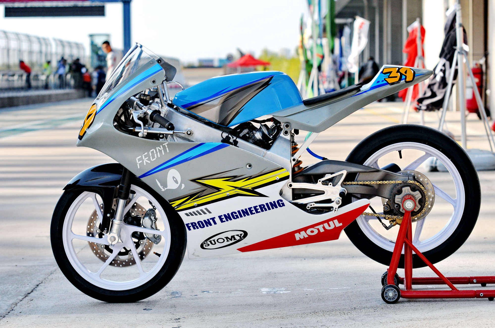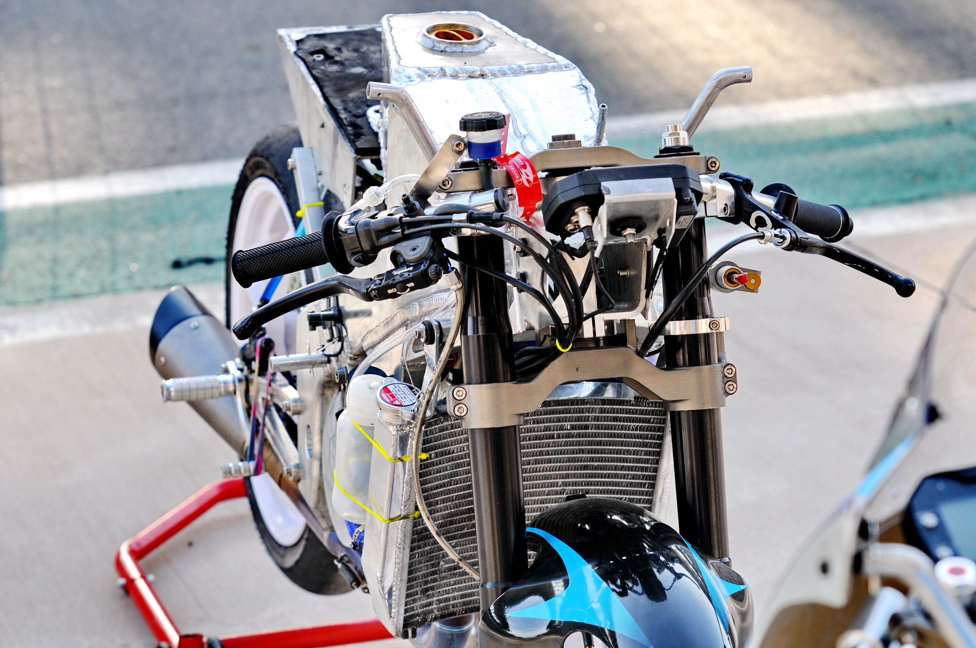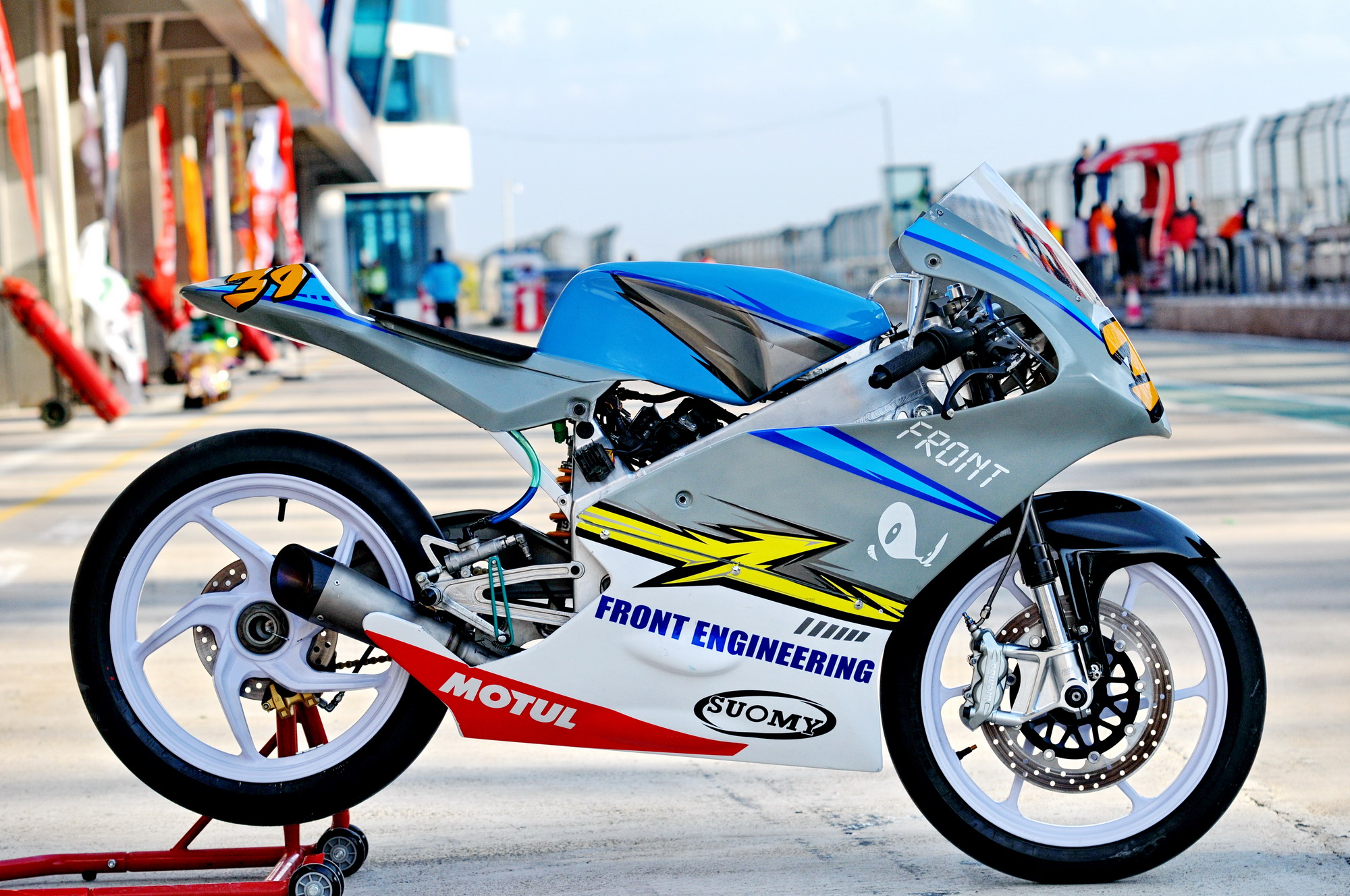 這部搭載單汽缸發(fā)動(dòng)機(jī)的賽車(chē),采用一副粗壯的鋁合金車(chē)架、后單搖臂的設(shè)計(jì),前懸掛、制動(dòng)系統(tǒng)都是一般量產(chǎn)車(chē)所難以采用的高配置。
