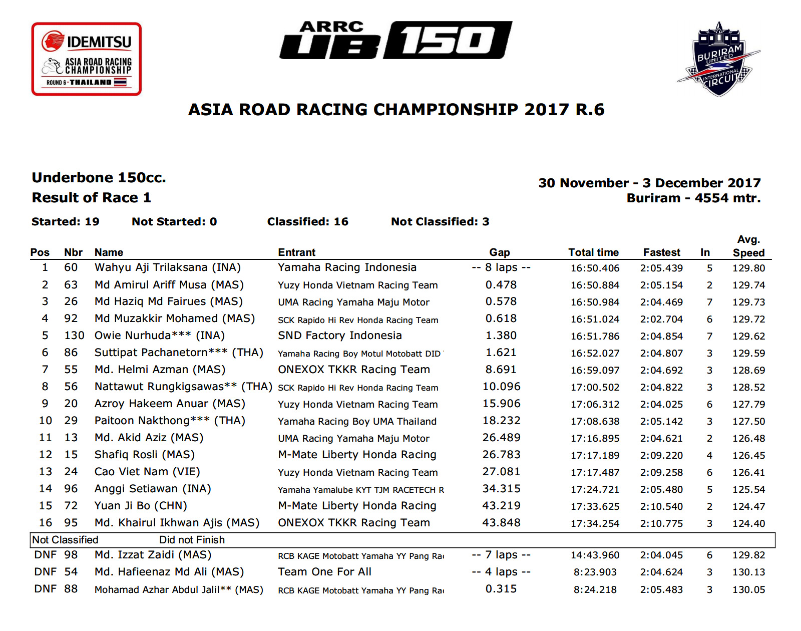 2017 ARRC 泰國站——各級別第一節(jié)比賽成績