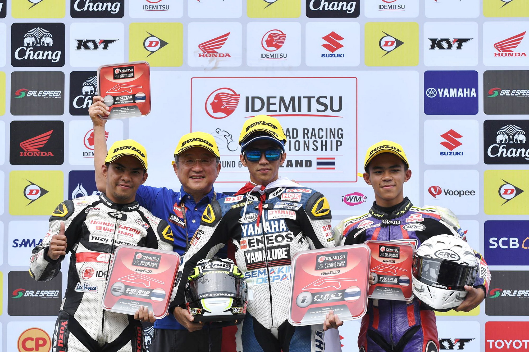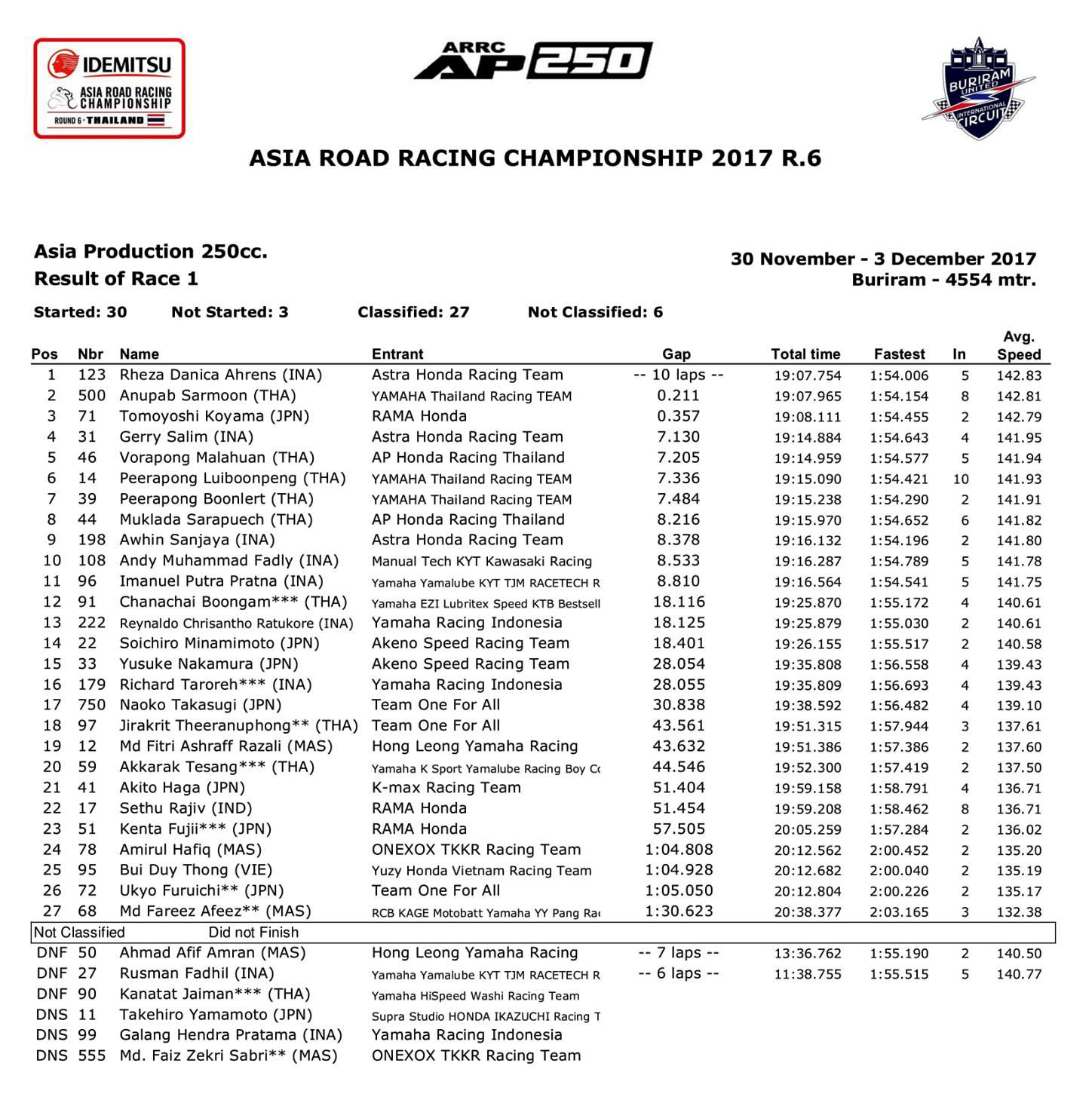 AP 250 級別的第一節(jié)比賽是日本、泰國、印尼車手的大混戰(zhàn)。十圈的賽程,最終由印尼車手 R. D. Ahrens 奪得了冠軍,泰國車手 A. Sarmoon 落后 0.211 秒獲得了第二,日本車手小山知良、落后頭車 0.357 秒拿到了第三。