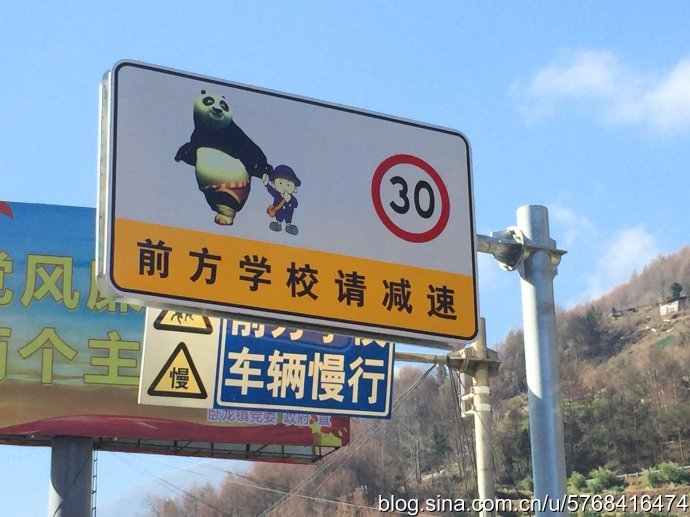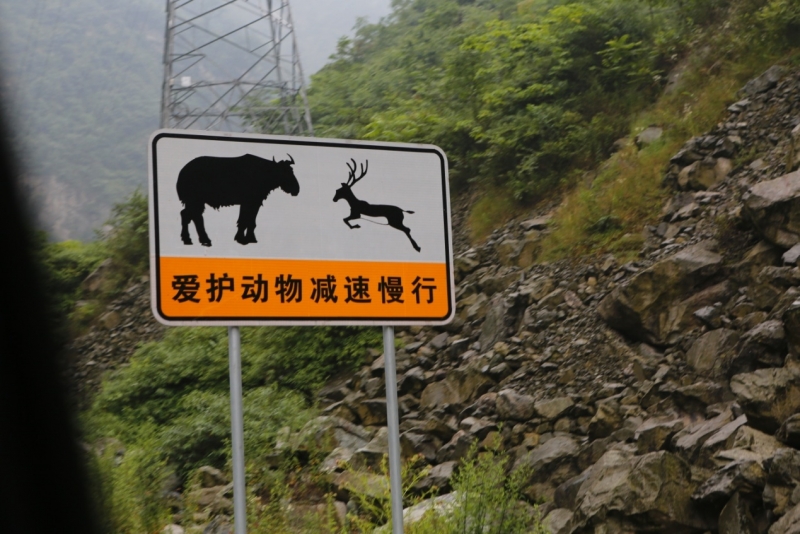 去臥龍的路上海拔漸漸升高,我們發(fā)現(xiàn)路上多了一些小動(dòng)物,還有很多呆萌可愛的熊貓路標(biāo),如:“禁止鳴笛,影響國寶休息”、“大熊貓帶小熊貓上學(xué),意思前方有學(xué)校,請加速慢行”等,遙望兩旁的深山竹林,國寶竟然深居其中,不可思議。