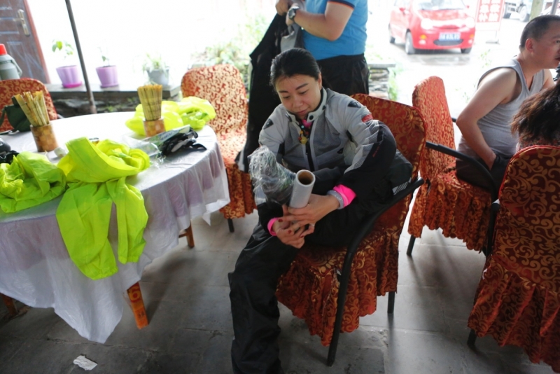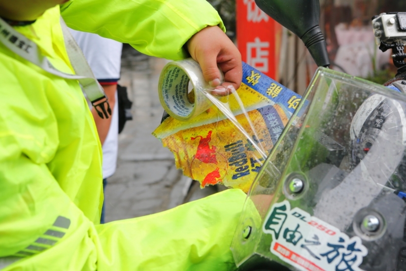 在這個(gè)令人感傷的地方,雨水不期而至,馬上要進(jìn)入藏區(qū)的高峰,大家紛紛做最后的準(zhǔn)備,雨衣、封鞋膠帶,隊(duì)長少尉竟然想到將紙殼沾在手把上,增強(qiáng)防水性,老司機(jī)就是套路多。
