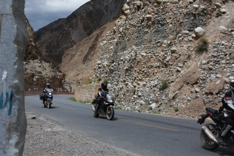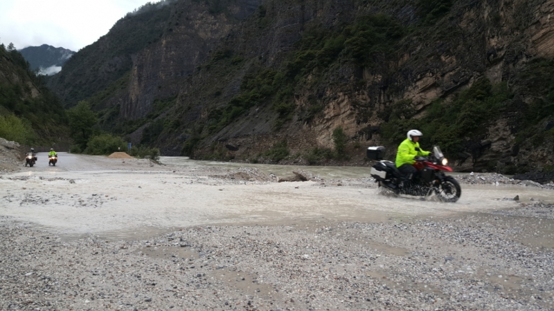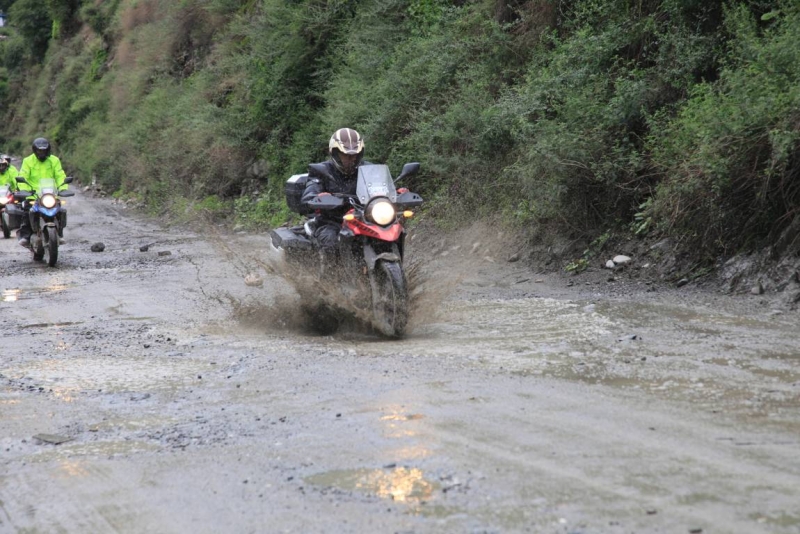 通過檢查站2公里左右開始進(jìn)入塌方落石路面,地面的坑洼不平,加上路基的沉陷,而且兩輛大貨車會車時會堵塞道路。還有各種各樣的大水坑,里面藏著碎石和泥漿。但是,這些對于我們的騎手來說都不叫事,而且有的騎手看到這樣的路還很興奮,adv就是干這個活的。我們的車隊順利通過塌方路段!我來說說通過這些路段的注意事項吧!首先,要充分利用摩托車的通過性,讓自己快速通過危險路。其次,選擇路線一定要合理。最后,給油不能猶豫,超車一定要果斷,而且盡量用檔位制動,忘記你的前剎車!過水坑土坡的時候,一定要穩(wěn)住油門,用一檔通過!