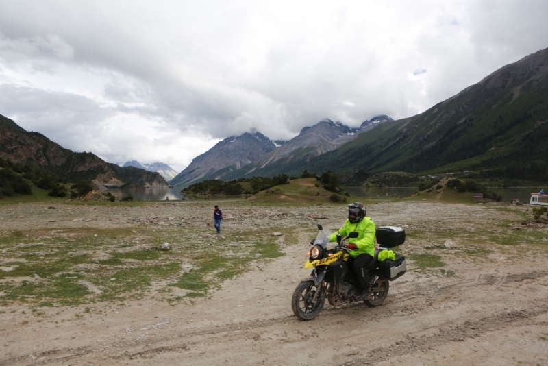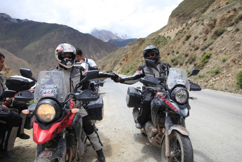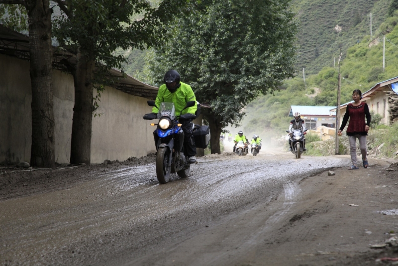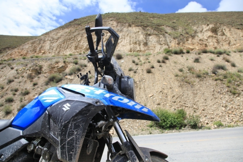 在翻越雪山稍作休整之后,車隊遇上了一個小意外。由于翻越雪山消耗體能過多,路面情況復(fù)雜,車隊中一輛藍(lán)色DL250通過彎道時失控,側(cè)滑倒在了路測的泥洼地里!面對此情況,騎手們均紛紛施以援手,并使出看家維修技能,迅速將小藍(lán)車維修妥當(dāng)!