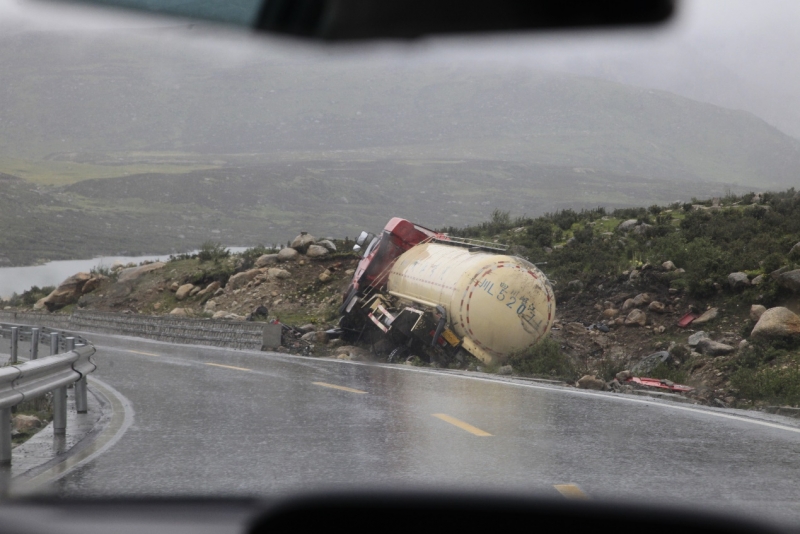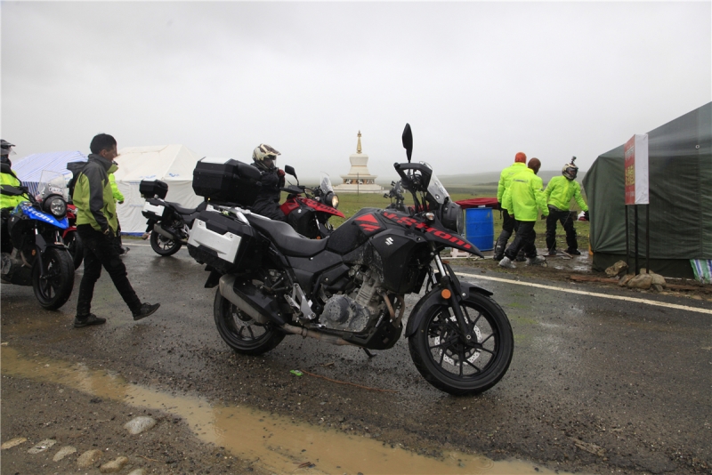 甘孜地區(qū)的天氣一直都不穩(wěn)定,突降的暴雨讓騎手們也迅速降溫。加上爐霍-色達(dá)的路一直上升海拔,更是讓行程更加困難。看著后勤車滿載爬坡的樣子真心有點不忍。