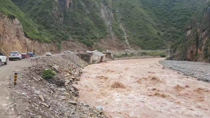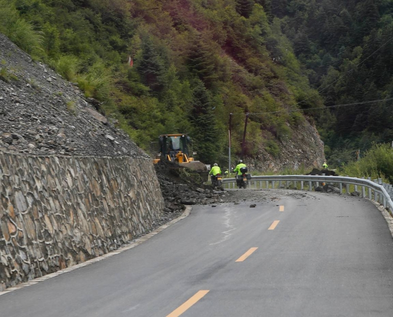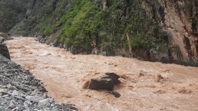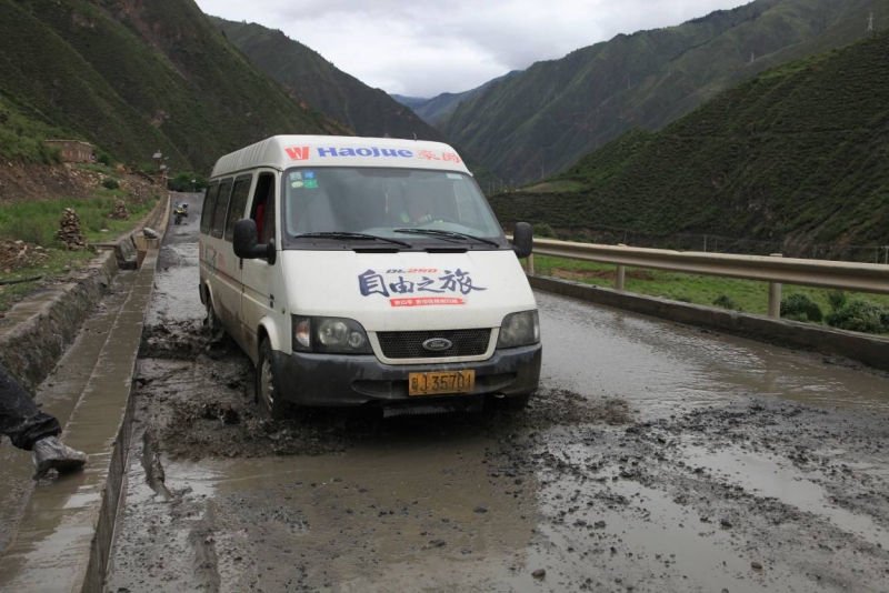 相比卡薩湖的寧靜,接下來的道路就變得心潮澎湃了,行走在G217國道上,延綿180公里的修建與非鋪裝路面使得車隊寸步難行,這里不光有洶涌的河水,還有殘垣的吊橋。這里也不光有泥濘路面,更有落石,塌方。