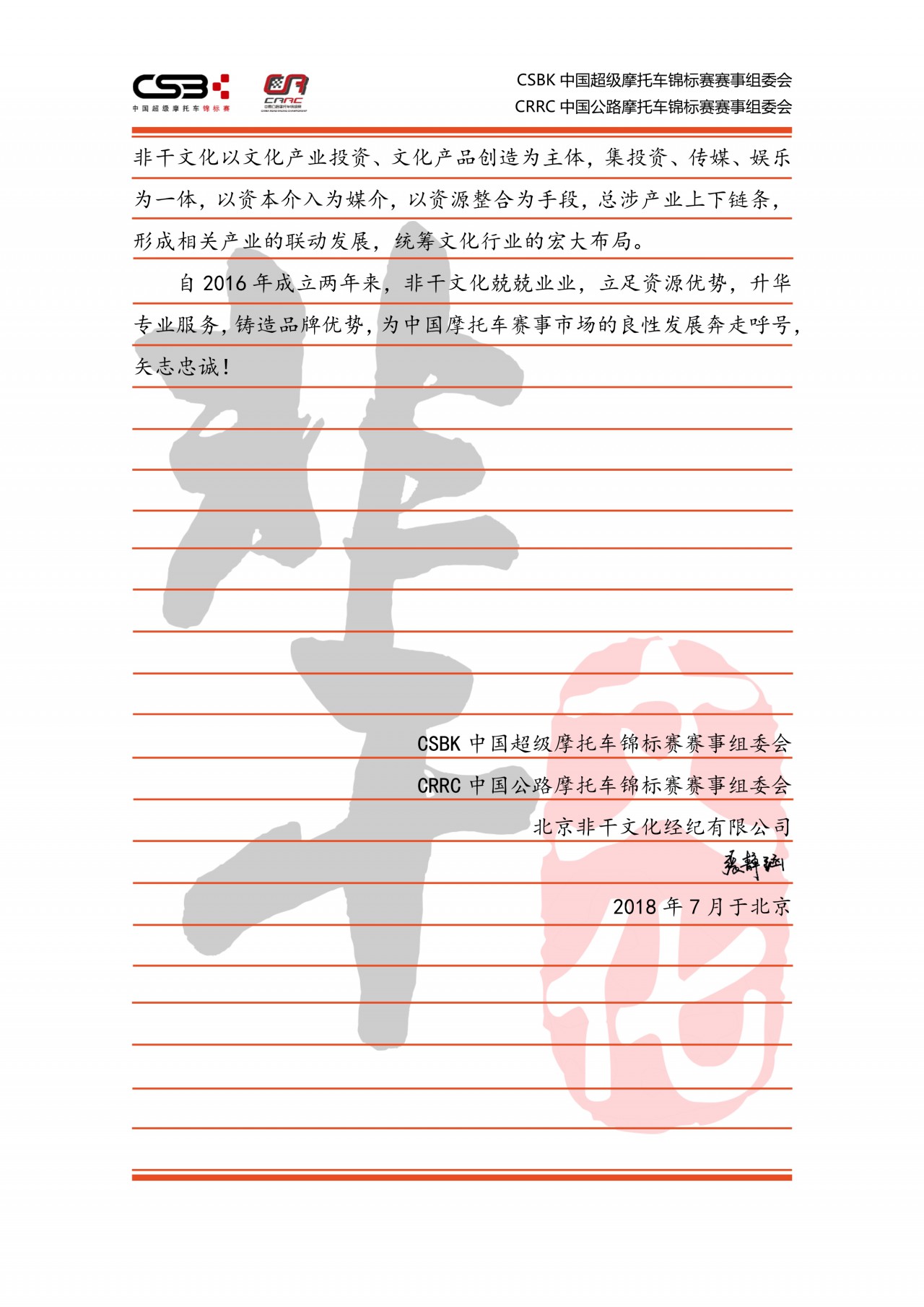 非干文化董事長張靜涵女士致2018年CSBK、CRRC(寧波站)一起奮斗同仁的一封信