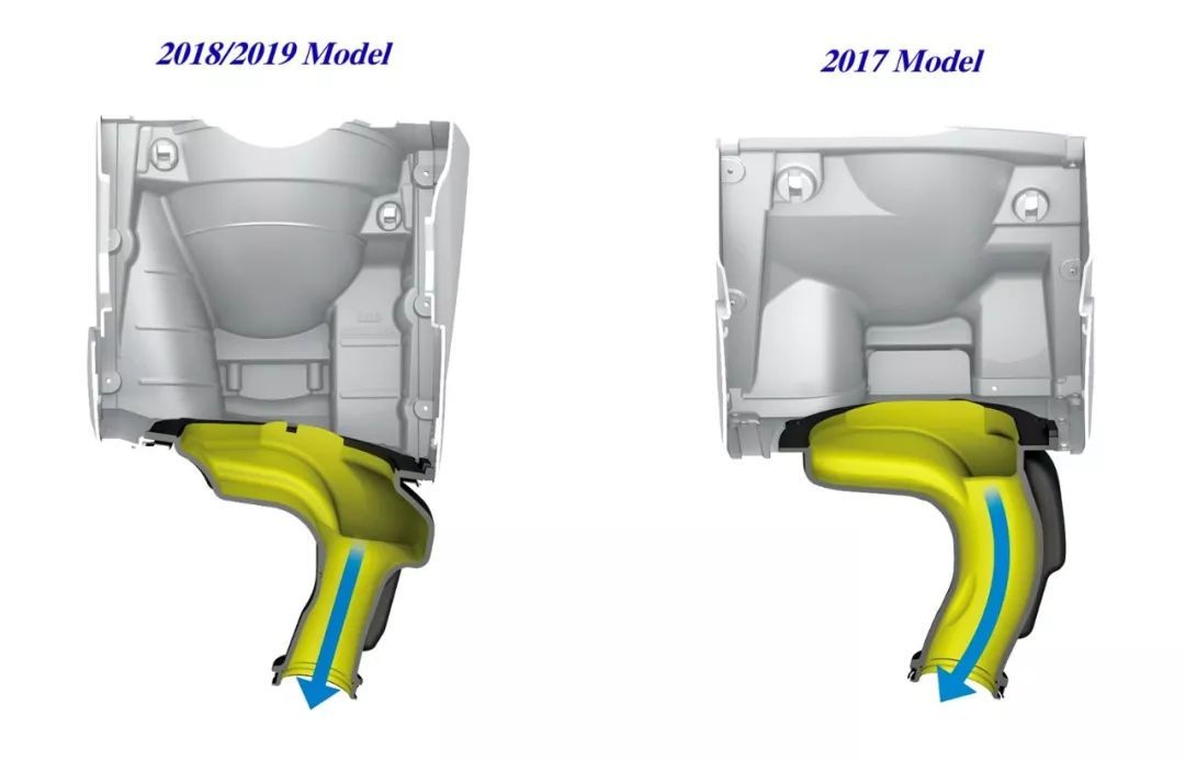 下圖:兩代 RM-Z 450 的空汽過(guò)濾器向電噴系統(tǒng)的進(jìn)汽狀態(tài)對(duì)比 CAD。