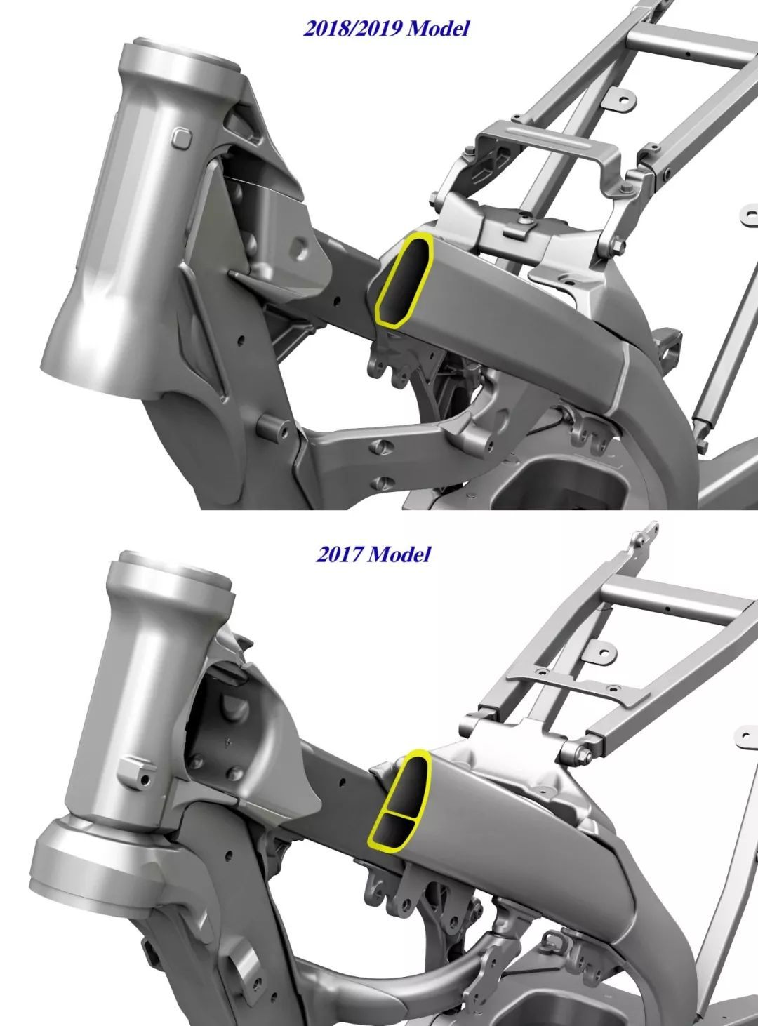 下圖:兩代 RM-Z 450 的車(chē)架截面對(duì)比。