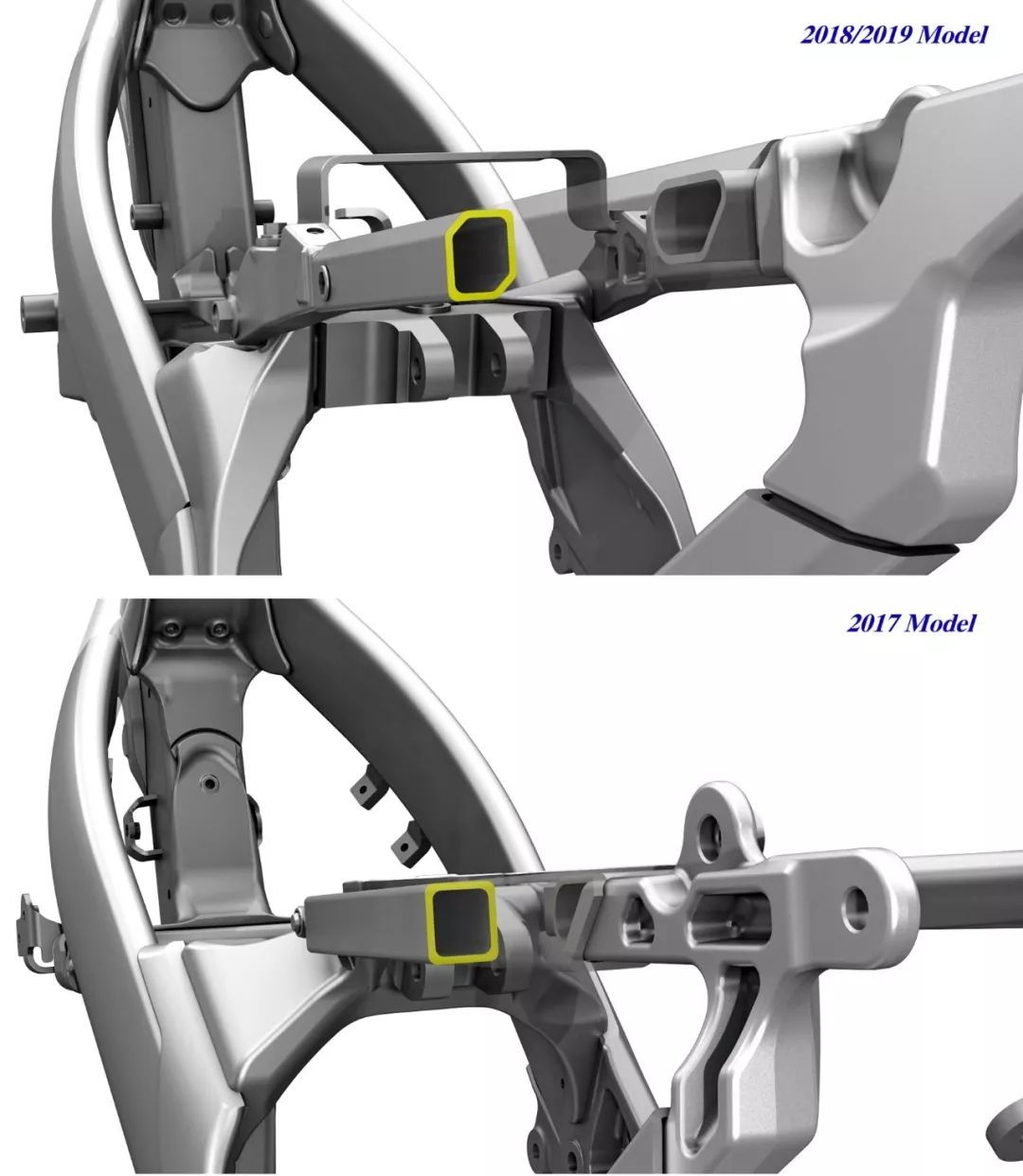 下圖:兩代 RM-Z 450 的后尾樑截面對(duì)比。