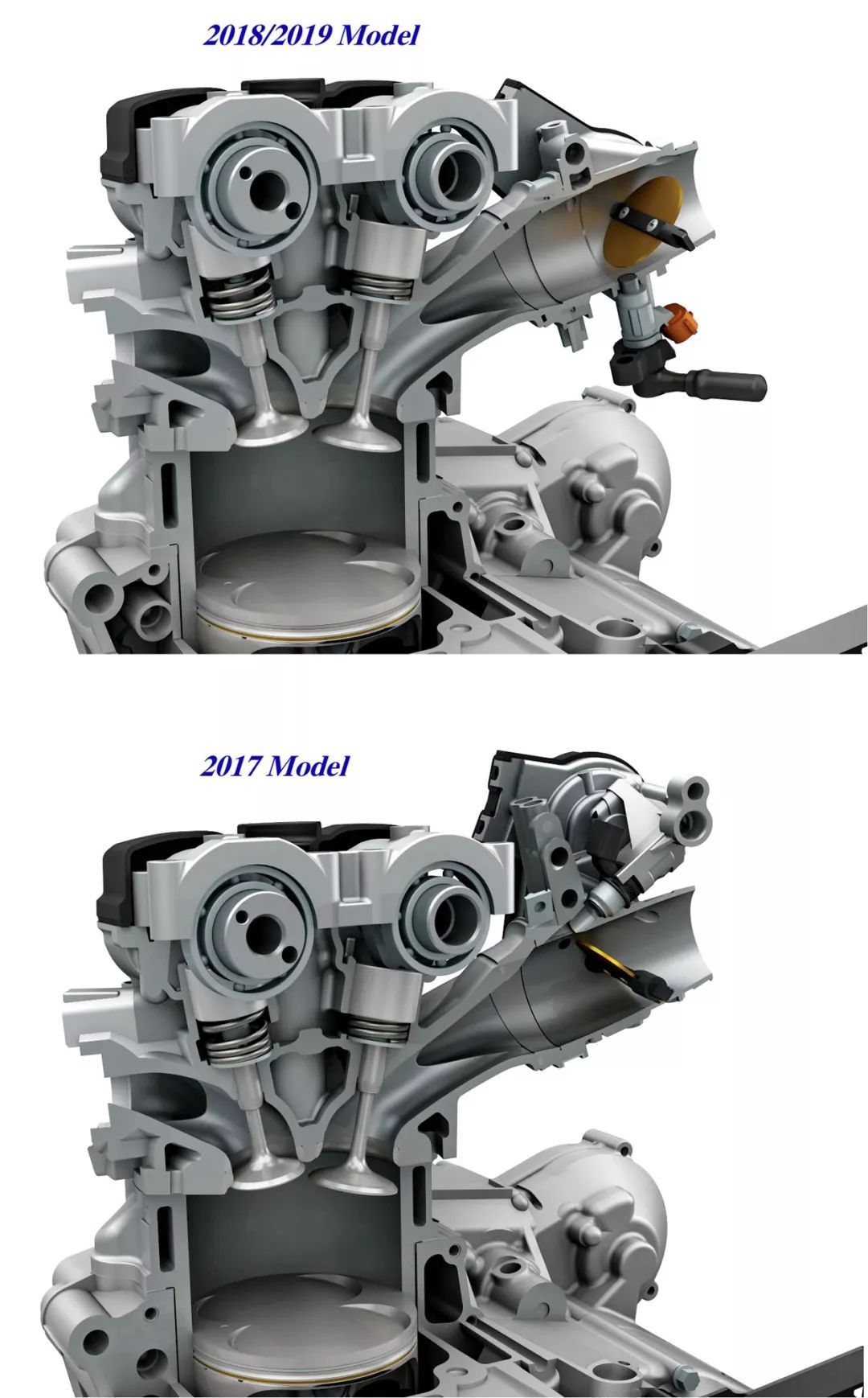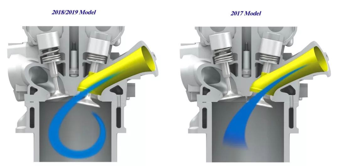 下圖:兩代 RM-Z 450 的汽缸進(jìn)汽道及進(jìn)汽歧管結(jié)構(gòu)對(duì)比。