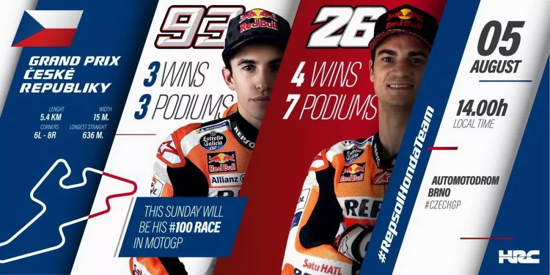 在捷克的這條布諾賽道,HRC 車隊的這兩位西班牙車手,馬昆斯獲得過三次冠軍(2012 年的 Moto2,2013、2017 年的 MotoGP),彼杜沙則拿下過四次的冠軍(2003 年的 WGP 125,2005 年的 WGP 250,2012、2014 年的 MotoGP)。