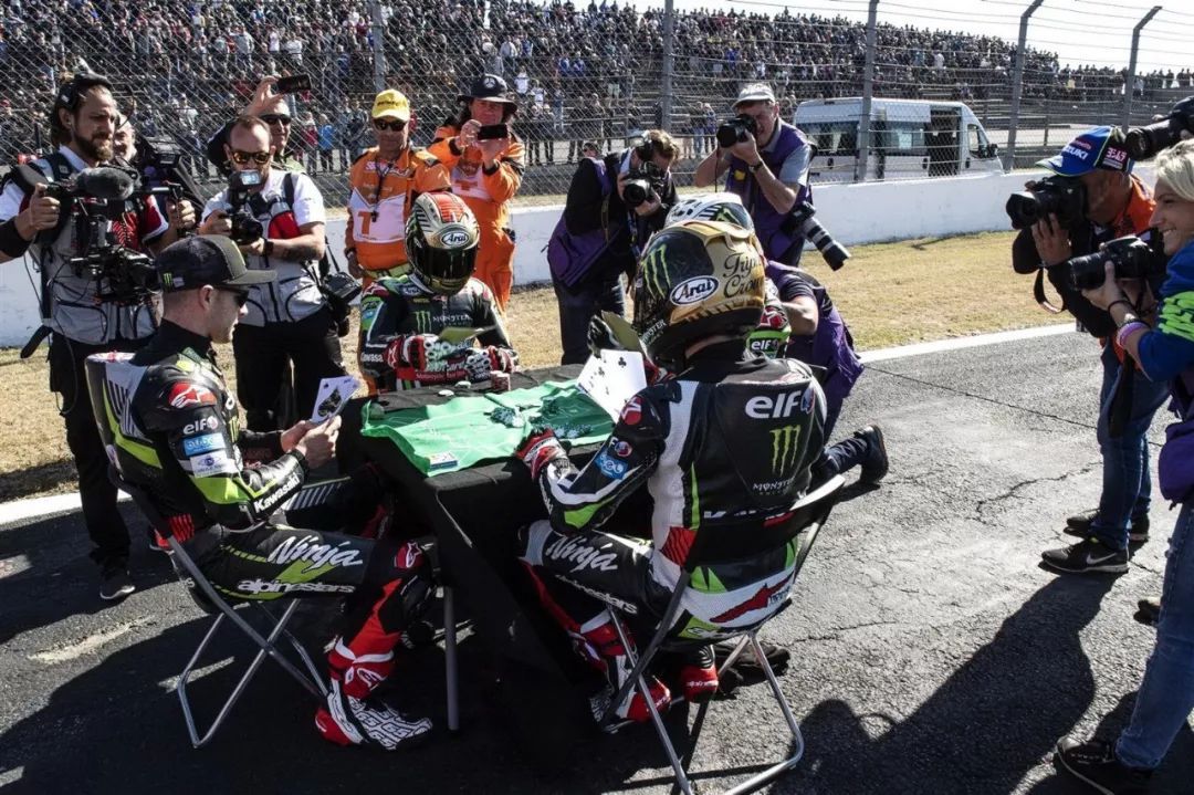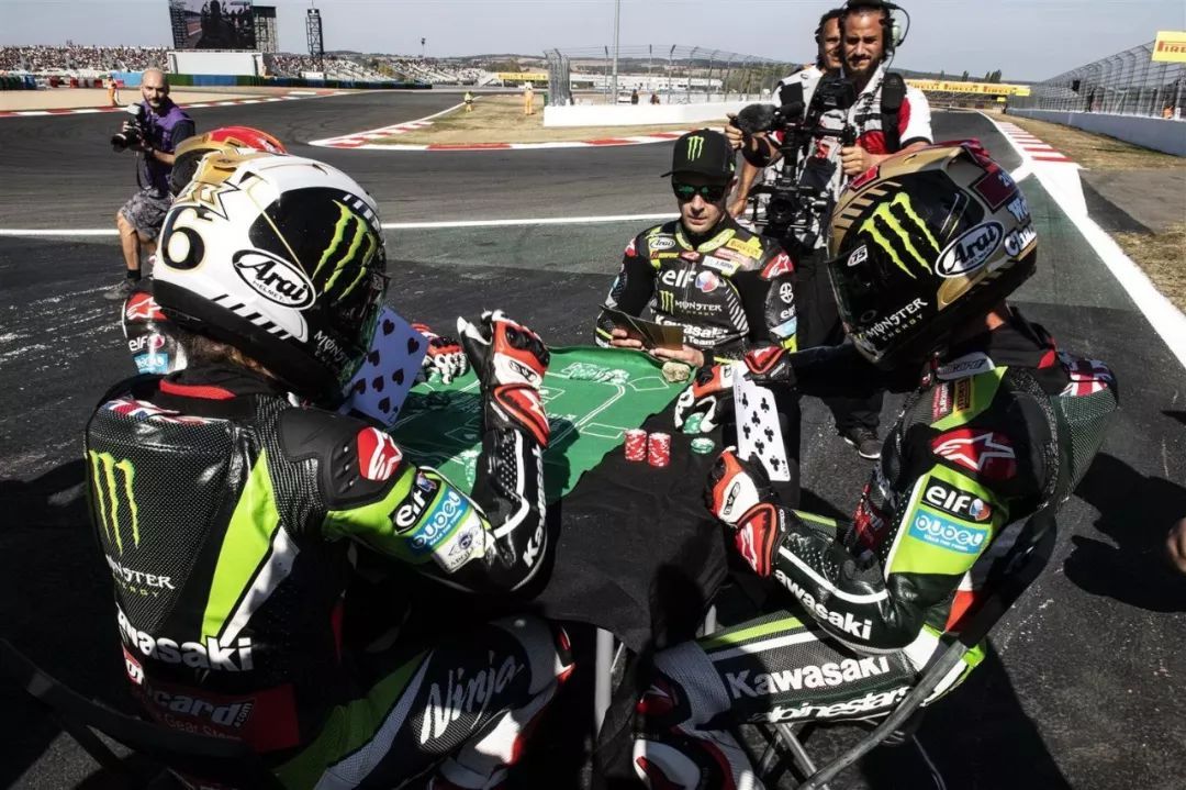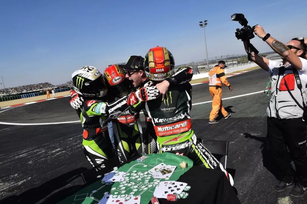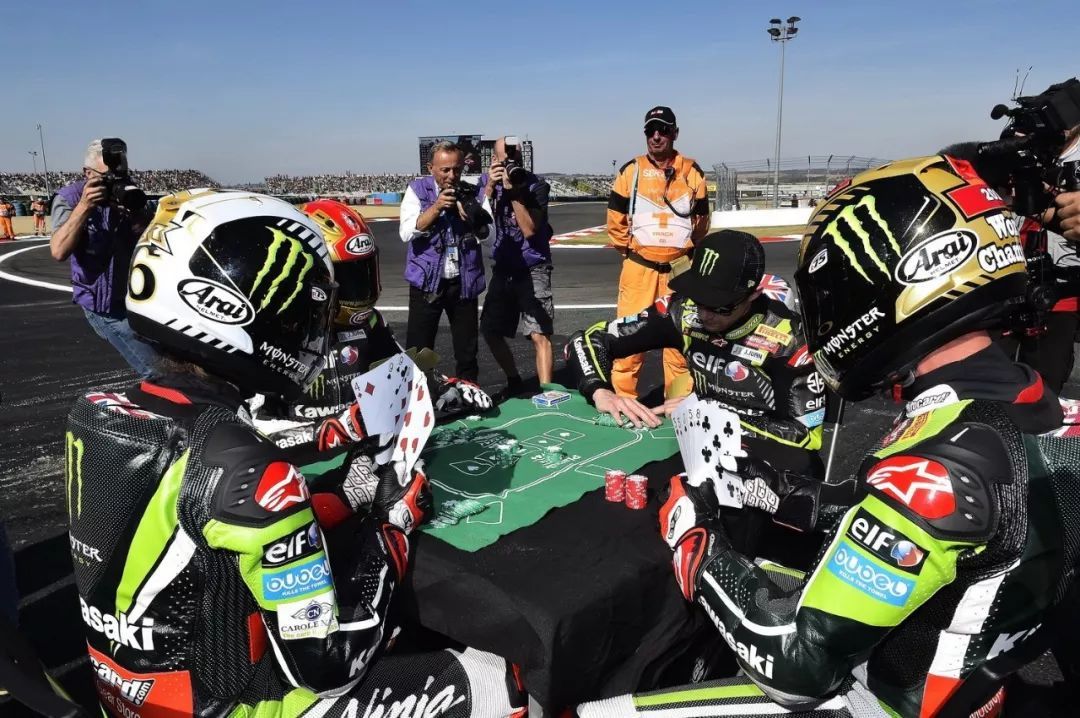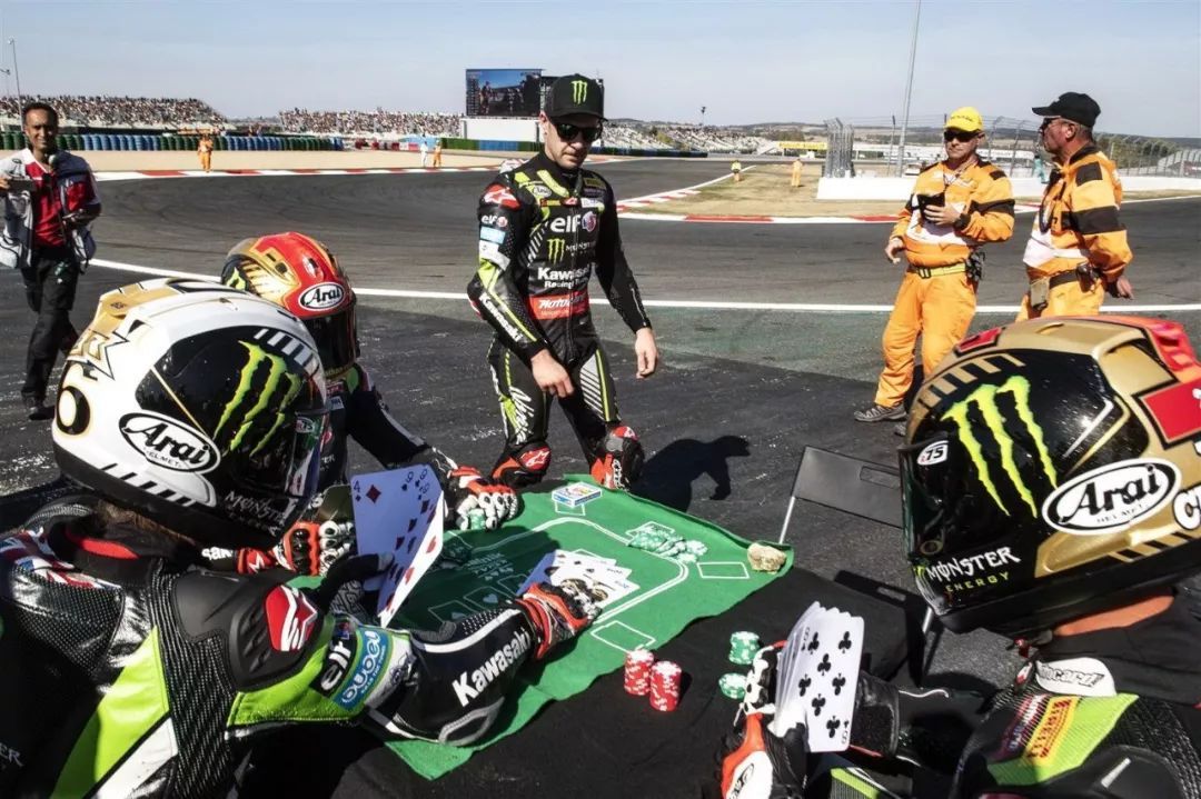 在比賽結(jié)束、跑道解封之后,雷亞在跑道邊組織了一桌牌局,以紙牌對(duì)抗他自己的三個(gè) “ 另類自我 ” 來(lái)慶祝他的新總冠軍。而另外的三個(gè)他,分別穿戴著從 2015 年開(kāi)始的、雷亞在 Kawasaki 車隊(duì)中不同賽季的賽車服和頭盔。