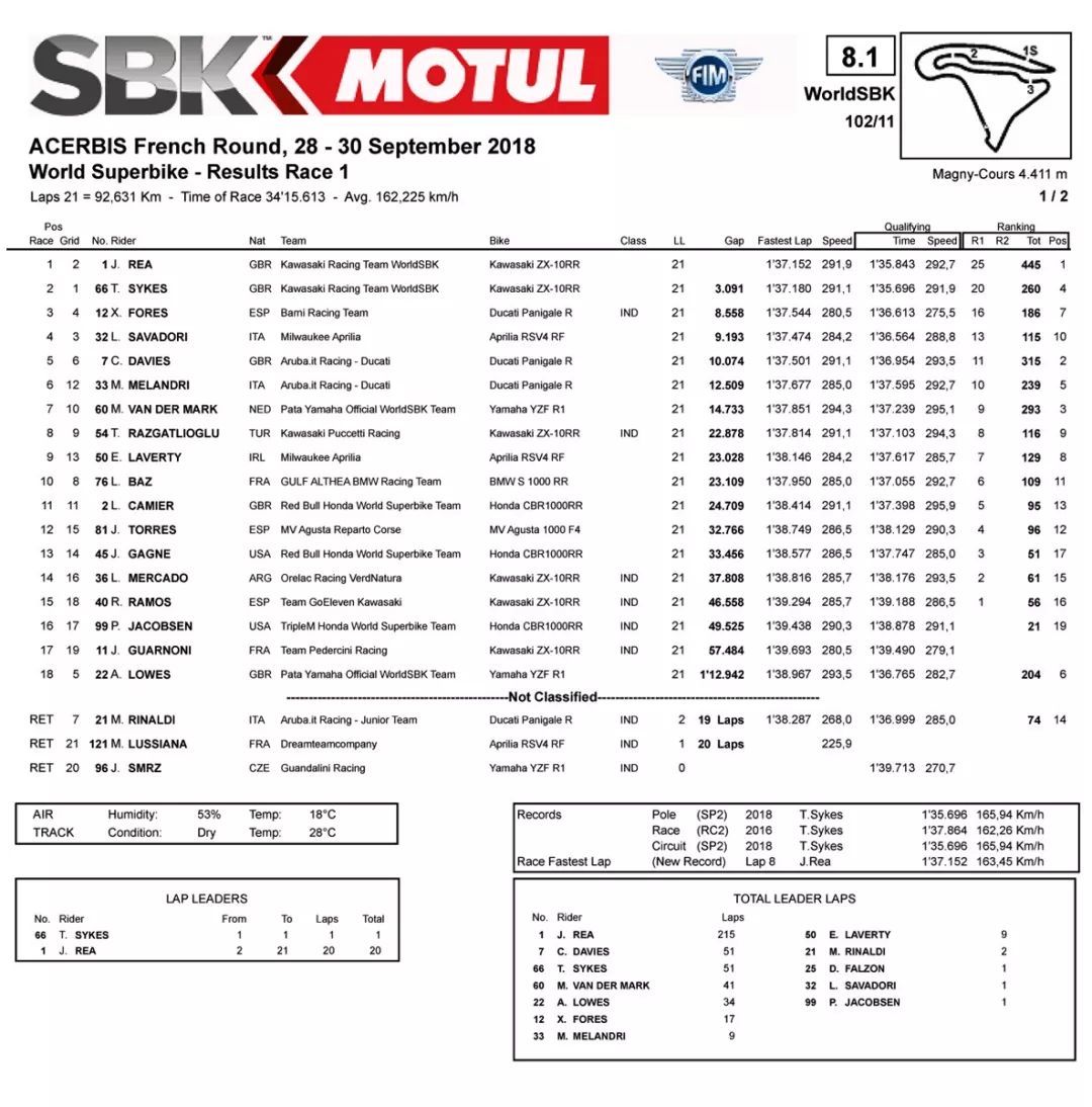 下圖:2018' WSBK 法國(guó)站第一節(jié)比賽之后的積分榜。