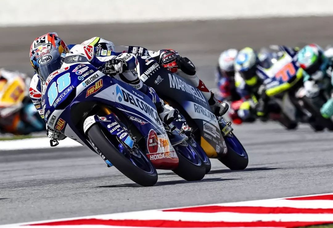 Moto3 級別的賽程是 17 圈,今天的大戰(zhàn)仍是一場激動人心的比賽。馬丁從排頭位起步,開局是熟悉的 Moto3 “ 群毆 ” 樣式,夾在車群中的馬丁在比賽初段、一度掉到了第十位,且面對賽道中一些經(jīng)過修補的路面時可能仍存的水跡,第一集團的車手們都不得不既要拼、又要小心翼翼,避免發(fā)生連鎖擦碰。馬丁的總冠軍挑戰(zhàn)者貝澤奇(M. Bezzecchi)在初段跑得較為積極,看樣子、明擺著就是盡量搶分,意在讓總冠軍的爭奪戰(zhàn)、留到西班牙瓦倫西亞的最后一場比賽。
