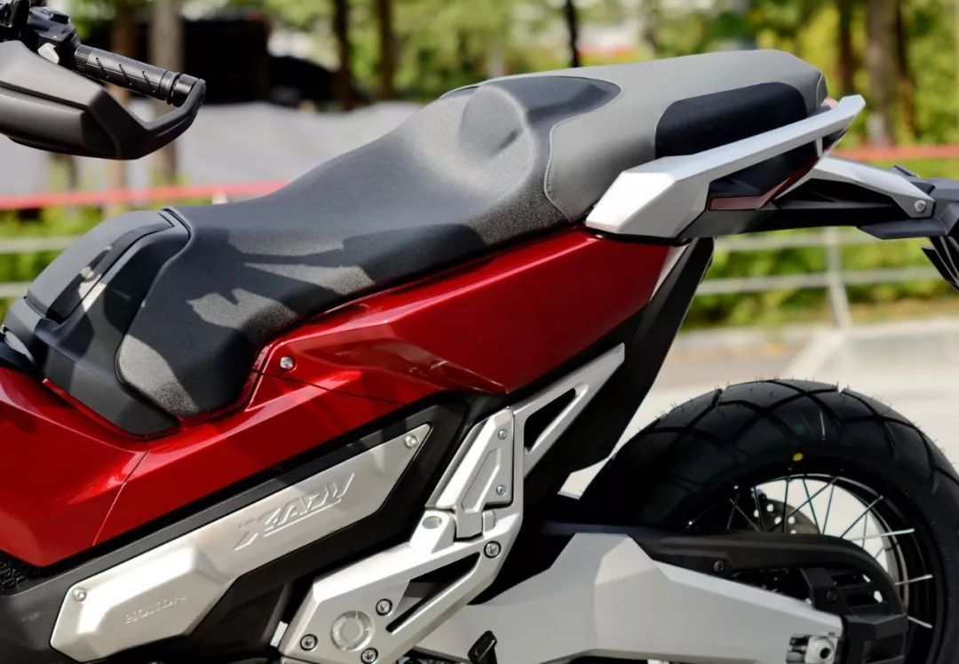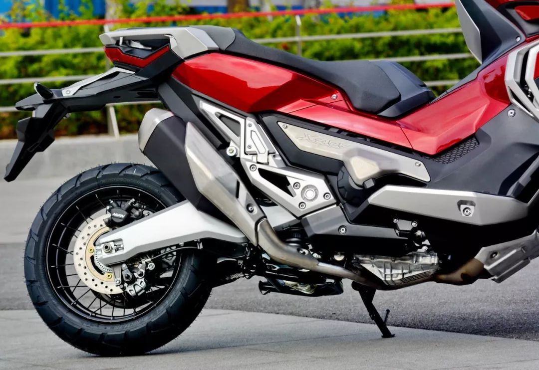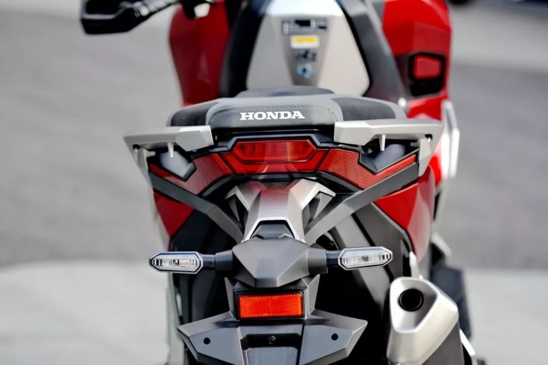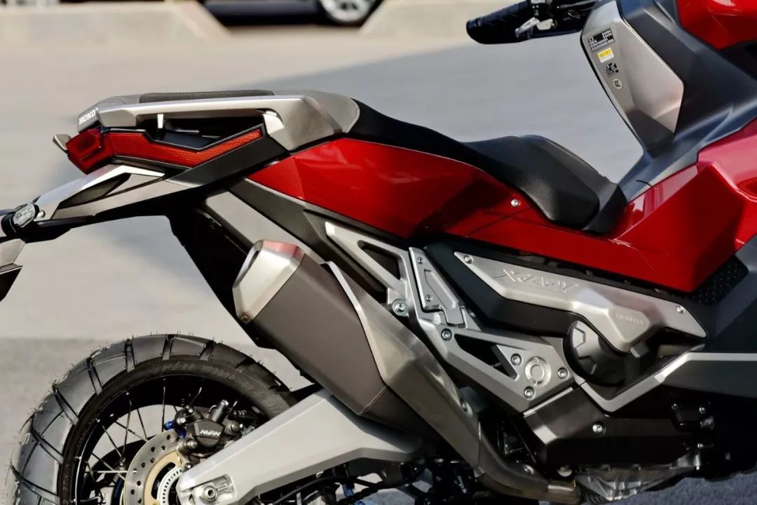 看到 X-Adv 的實(shí)車,視覺沖擊較大是凹凸的車體肌肉、有棱有角的線條,扁平的后剎車燈和座墊、或多或少地抵消了車頭的踏板風(fēng)格,基本感覺就是大型踏板車的車頭 + 越野的后半身印象。而高揚(yáng)的排汽管、充滿金屬味道的后搖臂,以及左右車把密密麻麻的按鈕、大屏幕的數(shù)字式儀表板、獨(dú)特視覺的前 17 后 15 寬坑紋輪胎,都讓這款 X-Adv 變得與眾不同。