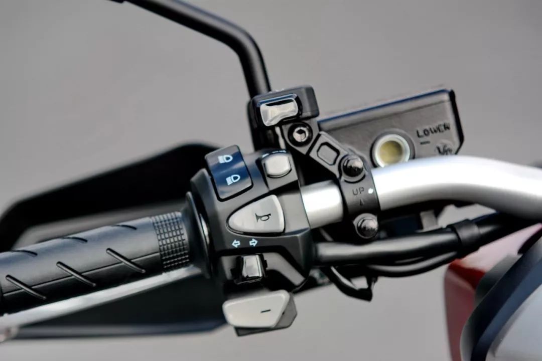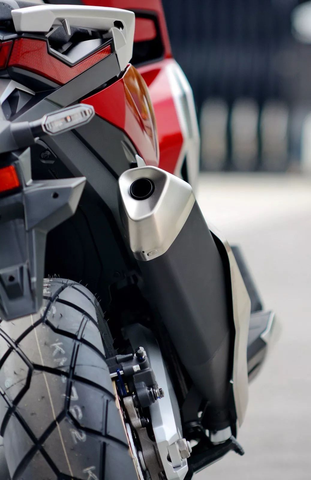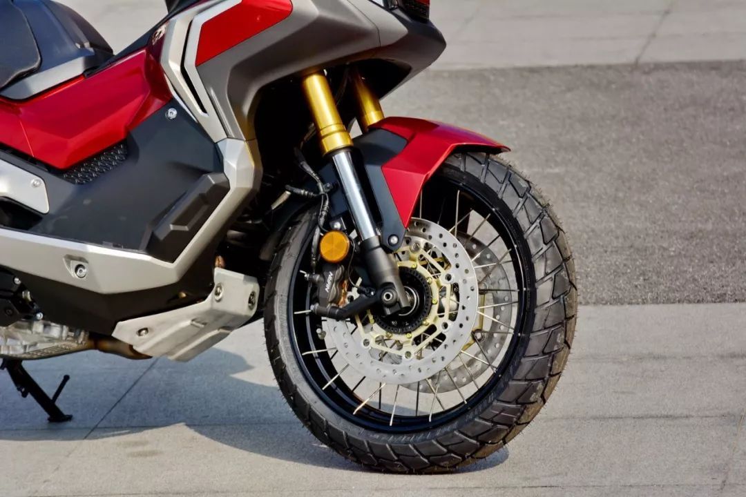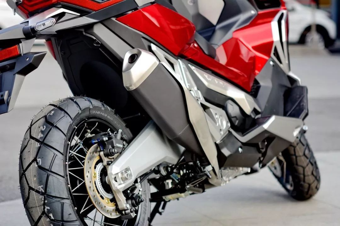 看到 X-Adv 的實(shí)車,視覺沖擊較大是凹凸的車體肌肉、有棱有角的線條,扁平的后剎車燈和座墊、或多或少地抵消了車頭的踏板風(fēng)格,基本感覺就是大型踏板車的車頭 + 越野的后半身印象。而高揚(yáng)的排汽管、充滿金屬味道的后搖臂,以及左右車把密密麻麻的按鈕、大屏幕的數(shù)字式儀表板、獨(dú)特視覺的前 17 后 15 寬坑紋輪胎,都讓這款 X-Adv 變得與眾不同。