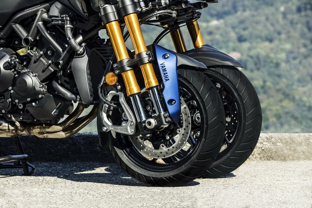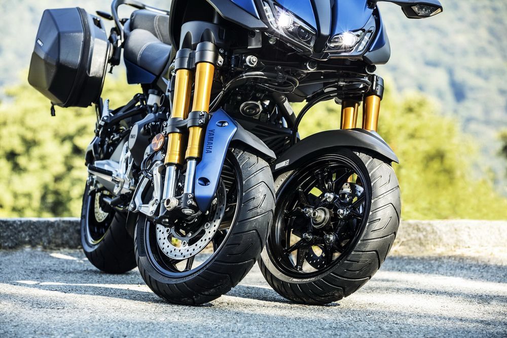 車(chē)體采用一副鋼管式的車(chē)架、鋁合金的后搖臂,Yamaha 引以為傲的 LMW(Leaning Multi-Wheels,多輪可傾側(cè))技術(shù),亮眼的、四根倒立前叉組成的前懸掛系統(tǒng)可實(shí)現(xiàn)駕駛時(shí)的 45 度最大傾角,全可調(diào)的后懸掛,前 15、后 17 英寸的輪框。