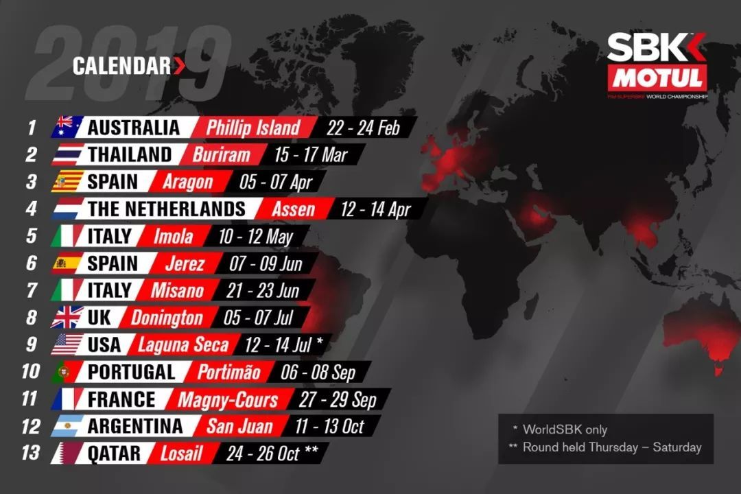 FIM 2019' WSBK 賽程表、日前基本落實(shí)。明年賽季仍舊是十三個(gè)分站的比賽,其中兩個(gè)分站在亞洲,南美洲(阿根廷)和北美洲(美國(guó))各一站,其余的九個(gè)分站在歐洲地區(qū)。