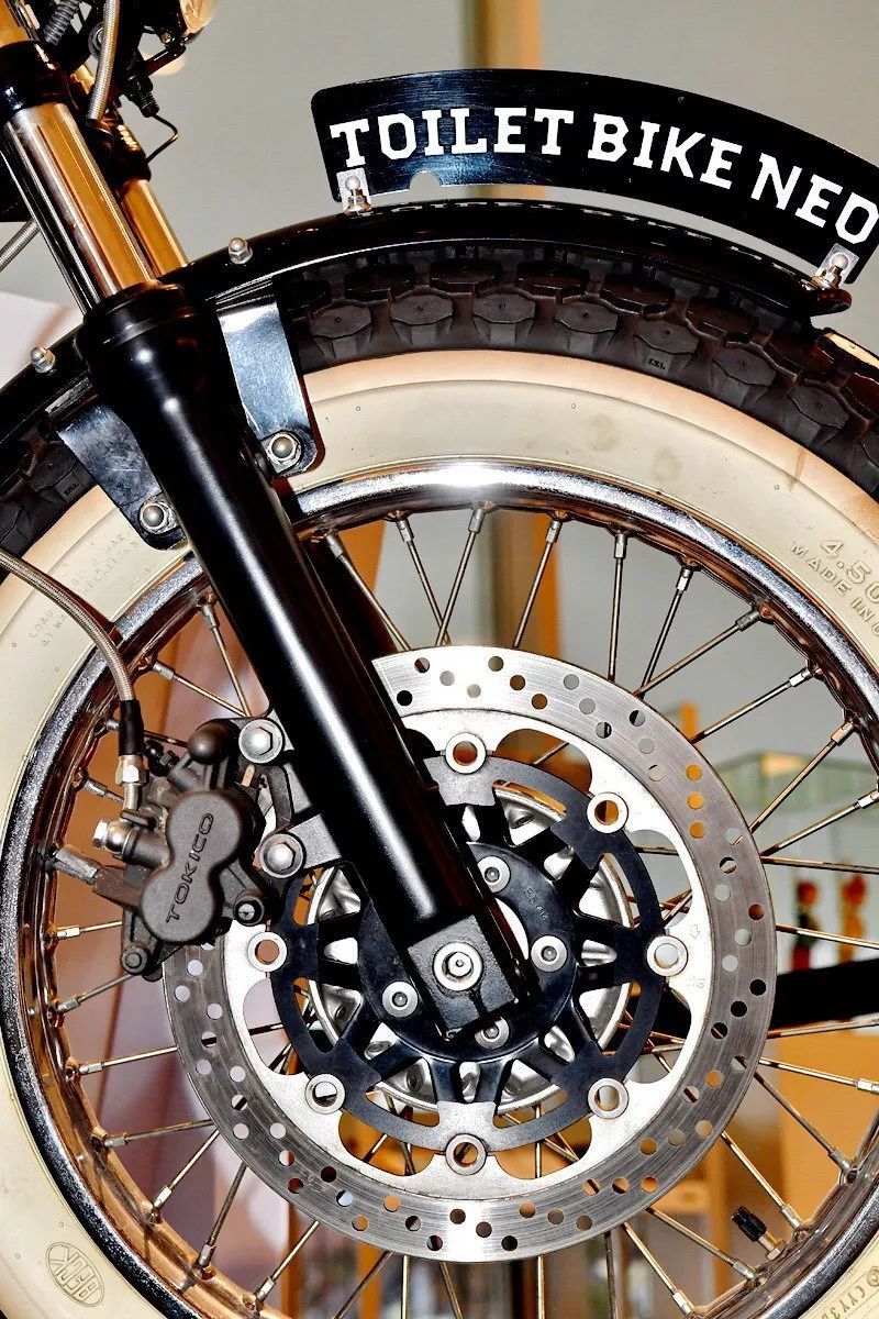 這臺(tái) “ 東陶新世代馬桶摩托車 ”采用了 Kawasaki Estrella(BJ250)作為基礎(chǔ)車修改而來,鞍座以及周圍部分做成了一個(gè)馬桶座的造型,車頭的傳統(tǒng)儀表板位置也有一個(gè)“小型馬桶”的飾物,車尾也有一大卷“草紙”造型的擺設(shè)。