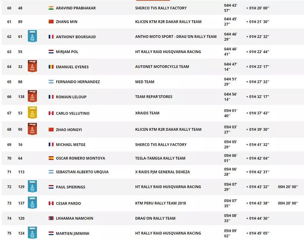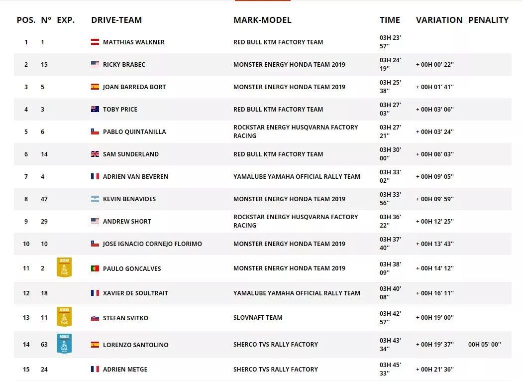 駕駛著 1 號車、達喀爾的應屆冠軍沃克納(Matthias Walkner),在比賽中的大部分時間里,都在追趕著第二賽段發(fā)車之后一直在前面領跑、HRC 車隊 15 號車的布拉貝(Ricky Brabec),在最后的40公里,沃克納最終以 22 秒的微弱優(yōu)勢超越了布拉貝,奪得了第二賽段的冠軍,布拉貝獲得了第二。奪得了第一賽段冠軍、駕駛 5 號車的巴雷達(Joan Barreda,HRC 車隊),落后頭車 1 分 41 秒、獲得了第三。