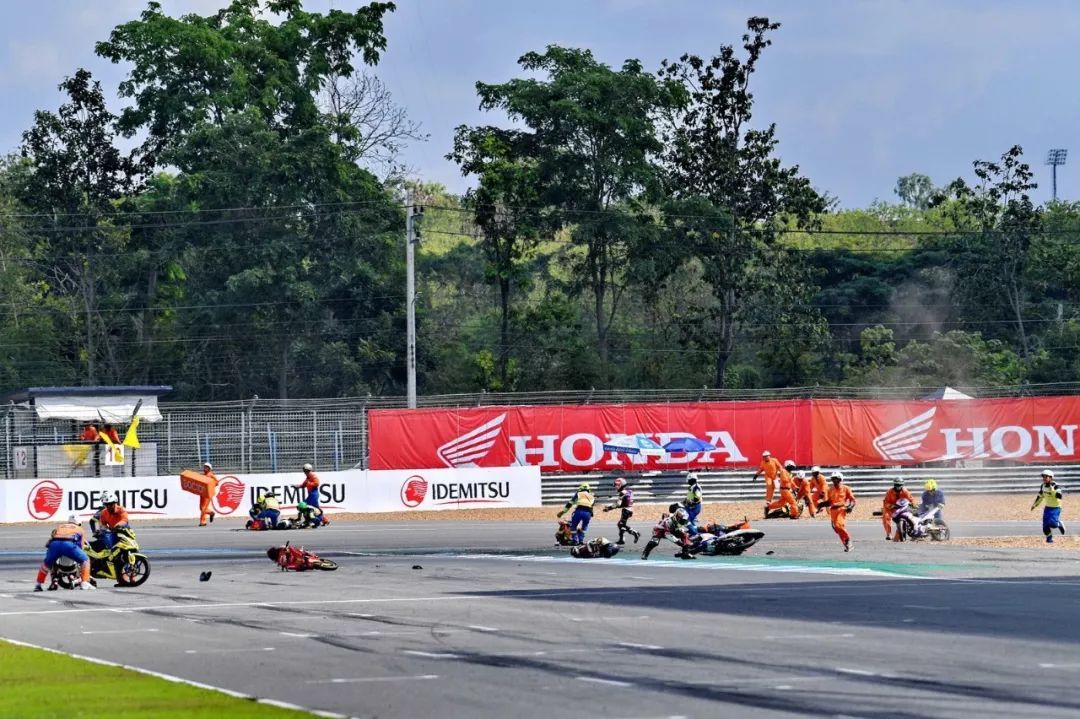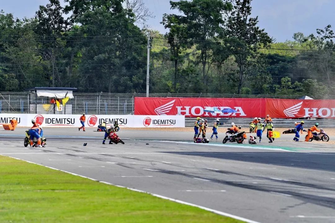 UB150 彎樑級別,第二節(jié)比賽、最后一圈的最后一個彎道,在拼搶激烈之下,前列集團發(fā)生波及近半?yún)①愓叩乃ぼ囈馔?,屬于第一集團的近十名車手摔倒在轉(zhuǎn)入跑道大直路前的彎角,賽車零件散布了一地。而第二節(jié)比賽,出場參賽者的數(shù)量為 26 人。