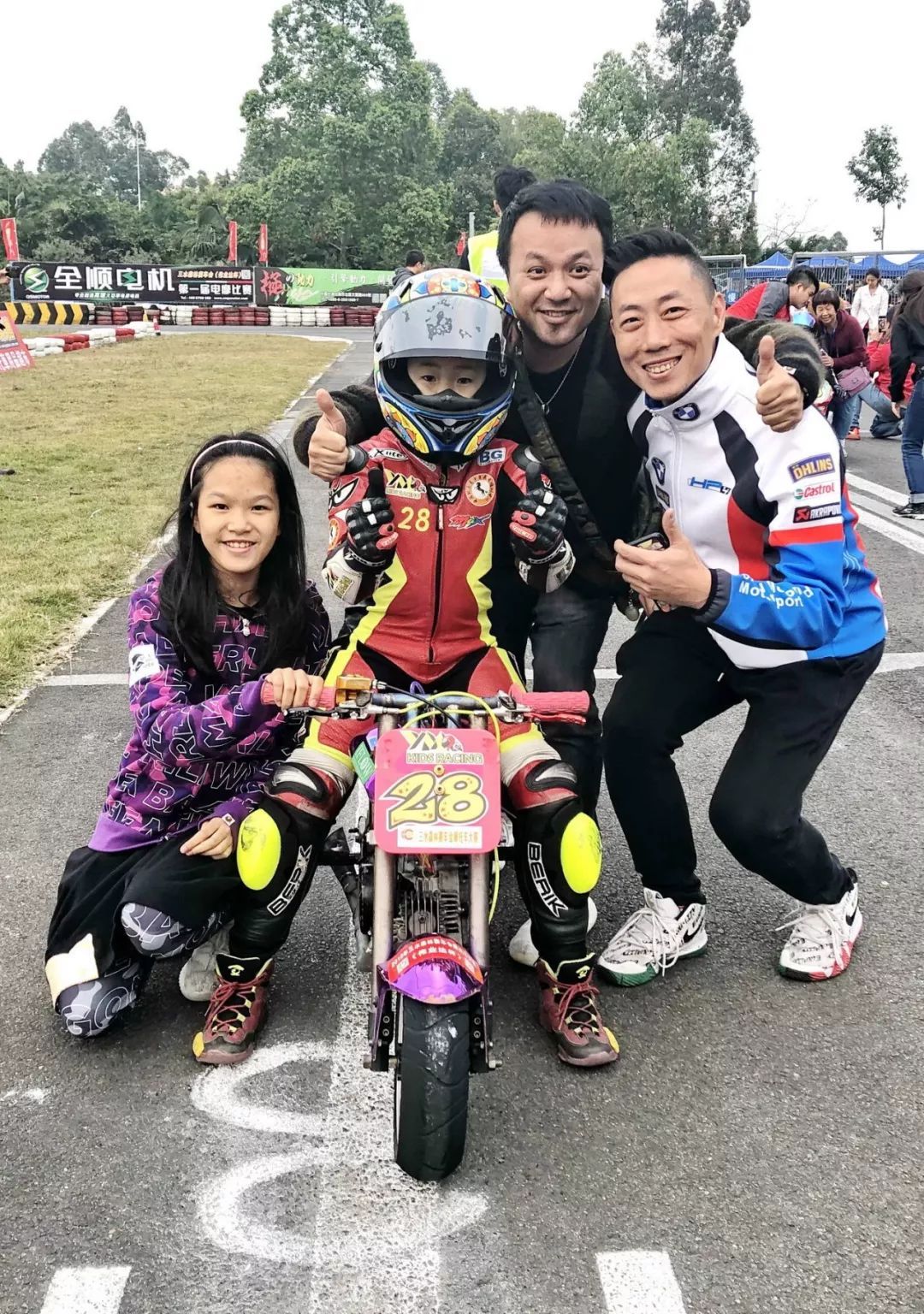 當我真正參與摩托車運動以后,我非常了解這項運動的危險性的,但危險因素是可以有效控制的。像我們的小朋友都是使用最高標準的安全裝備去玩車的,在少兒階段練習比賽、都是幾十公里的時速在賽道中跑,但穿戴的裝備與專業(yè)車手200多公里時速之下的裝備一樣,這個是足夠的保護。另外我們要求他們只在安全的封閉賽道上練習,這個也最大限度地保障安全。小朋友自身技術(shù)會有從慢到快、循序漸進的一個過程,比一般到了成年之后才開始去跑賽車安全了很多、很多。當然所有運動都是有一定危險性的,但賽車不一定會比其他運動有更高風險。