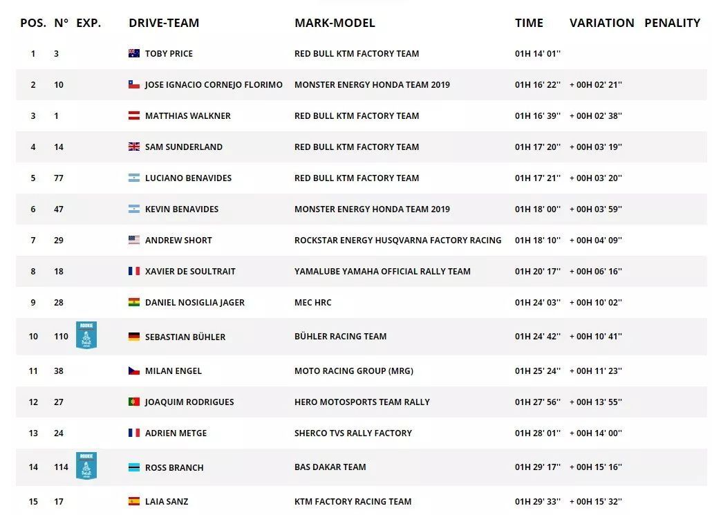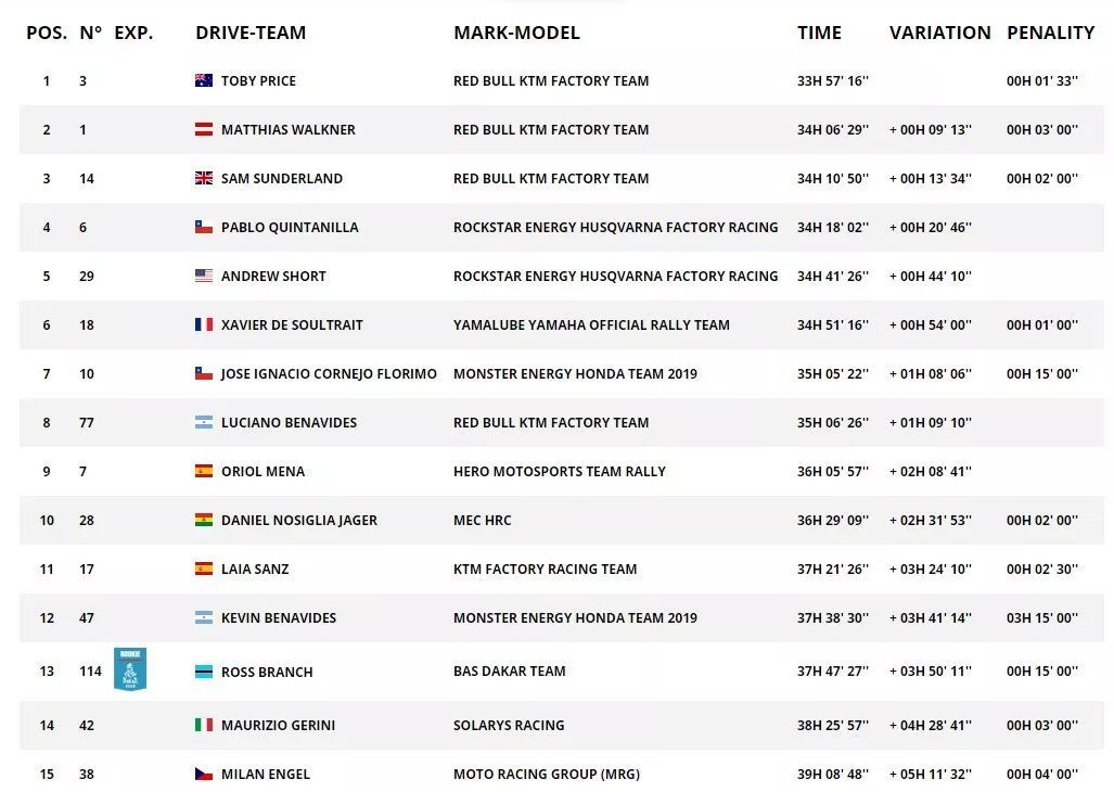 在今屆比賽開賽前幾周手腕受傷,在比賽期間一直倍受外界懷疑其競(jìng)爭(zhēng)力的普萊斯,順利拿下了最后一個(gè)賽段、也是他在今屆比賽唯一的一次賽段勝利,最終奪得了 2019 年達(dá)喀爾拉力賽的總冠軍,為 KTM 的連勝記錄延續(xù)至第十八年。這也是普萊斯繼 2016 年之后、第二次奪得達(dá)喀爾拉力賽的冠軍,而在 2016 年的比賽中、普萊斯拿下了五個(gè)賽段的冠軍。