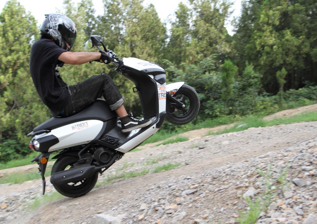 相比氣勢(shì)磅礴的多缸大排量特技,小排量踏板特技在觀賞性上也是不落下風(fēng)。得益于輕便車身的便捷操控,踏板車特技給人的感覺(jué)是輕靈舒展,同樣是抬前輪,高手們的駕姿轉(zhuǎn)換、速度和角度控制會(huì)看得你眼花繚亂,這種與車共舞的精彩車技,令年輕車手們熱血沸騰、躍躍欲試。練習(xí)踏板車特技的成本也能讓大多數(shù)一般收入的車手承受,除了傳動(dòng)系統(tǒng)和操控系統(tǒng)的適當(dāng)改裝之外,打造一款能夠愉快玩耍的特技踏板車并不需要太大的投入,一般情況下幾千元就足夠了,遠(yuǎn)遠(yuǎn)低于那類“發(fā)燒級(jí)”的踏板車外觀和動(dòng)力改裝。我接觸的那些練習(xí)踏板車特技的年輕人,很多人都是三五千元買輛舊車,再花點(diǎn)錢改動(dòng)一下,車便宜,摔了也不心疼,騎壞了修好也花不了多少錢。