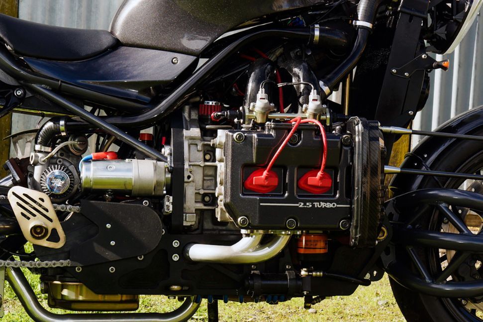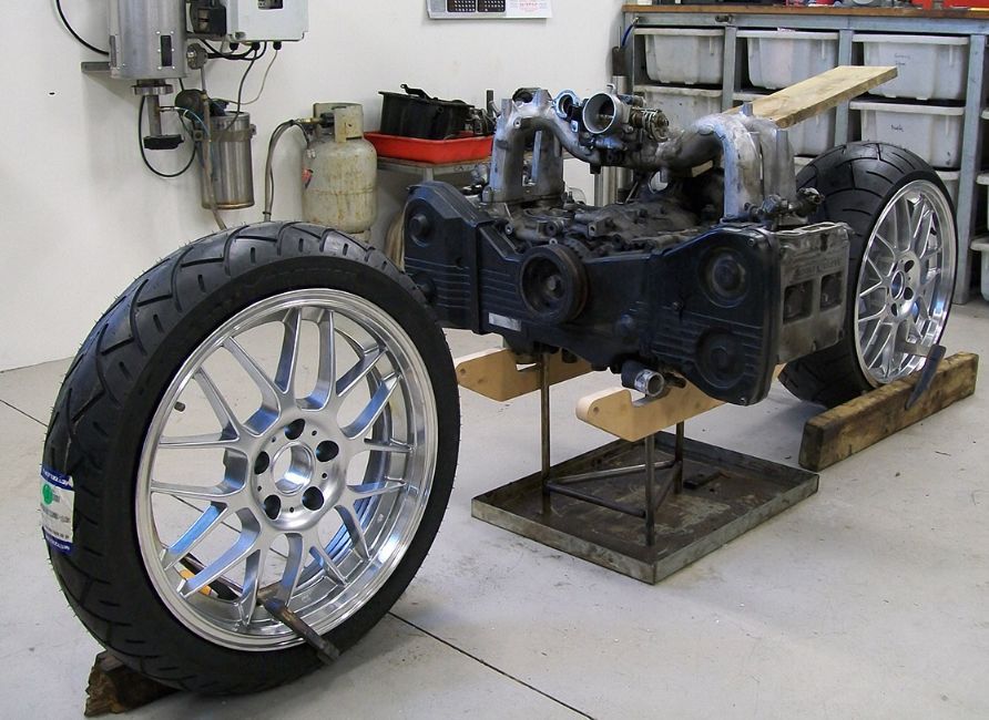 在新西蘭市場,斯巴魯最常見的發(fā)動機是EJ系列,排量從1.5L到2.5L都有,主要都是安裝在1989年之后的車型。馬薩爾放棄了流行的2L發(fā)動機,選擇了第二代WRX的EJ25渦輪增壓發(fā)動機。不過,原配的渦輪增壓器太大,不適合摩托車車架,為此馬薩爾從斯巴魯力獅上弄來較小的雙渦輪裝置來替換。由于斯巴魯發(fā)動機力氣很大,只用上了兩速自動傳動系統(tǒng),馬薩爾對其作了改裝以適合摩托車之用,并通過鏈條來驅動后輪。因此,“瘋狂拳擊手”沒有腳踏換擋桿,騎手要通過安裝在把手上的按鈕來換擋。