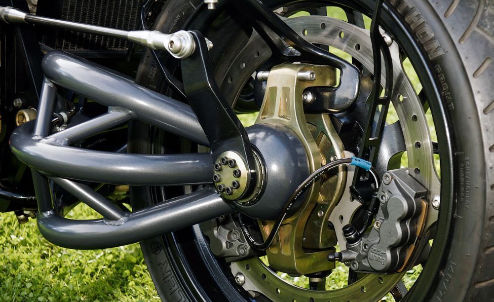 我們知道,常規(guī)的摩托車前輪都安裝了正立式或倒立式前叉,但是“瘋狂拳擊手”不這樣干,安裝了獨特的輪轂中心轉向機構,作為轉向機構的前擺臂從發(fā)動機和車架底部探出,延伸至前輪的輪轂,取代了司空見慣的兩只前叉。由于前制動、轉向機構、前減震器之間變成“絕緣”,各自獨立工作而不受到影響,從而實現(xiàn)了很穩(wěn)定的操控性能。