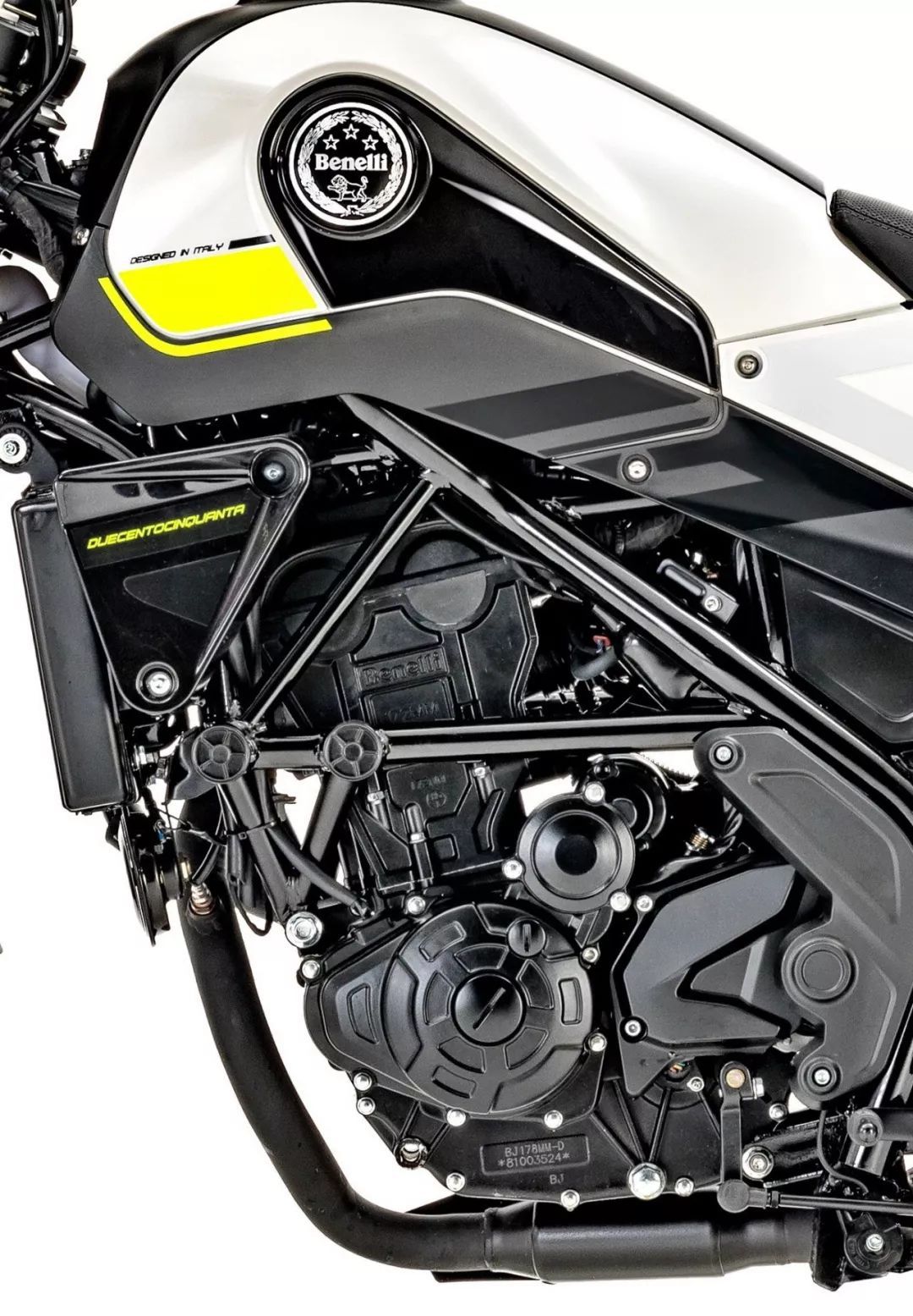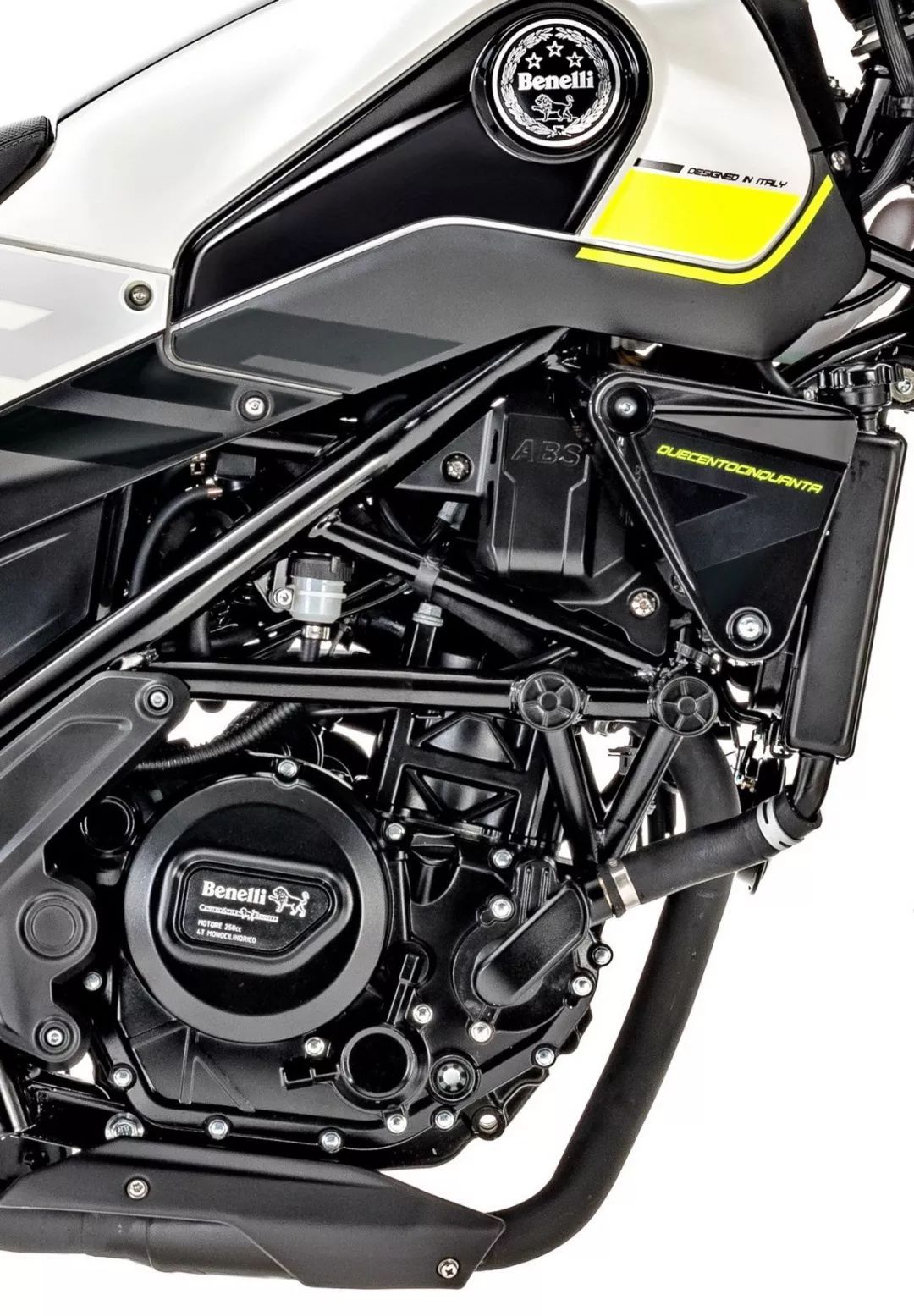 Leoncino 幼獅 250 搭載一副水冷四沖程單汽缸、DOHC 四汽閥的發(fā)動機(jī),缸徑、行程為 72 mm x 61.2 mm,排汽量 249 cc,節(jié)汽閥口徑為 37 mm 的電子燃油噴注系統(tǒng)、六檔的變速齒輪箱,最大動力輸出 18 kw(約 24.5 匹)。在數(shù)據(jù)上、幼獅 250 的動力單元與國內(nèi)現(xiàn)行銷售中的 BJ250-15A 相同。