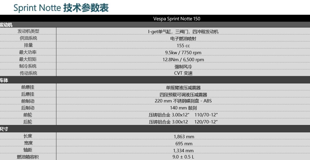 Vespa Sprint Notte 150 除了炫酷的黑色涂裝,還配備了明亮的LED燈具,讓騎行更加安全。精心研發(fā)的i-get動力平臺150cc四沖程發(fā)動機,采用單缸風(fēng)冷三氣門設(shè)計,配合精準(zhǔn)的電子噴射系統(tǒng),營造更加平順的動力輸出。變速箱內(nèi)部細(xì)節(jié)得以優(yōu)化,實現(xiàn)更加安靜及舒適的騎乘體驗。在保證環(huán)保的同時,這部發(fā)動機還擁有更優(yōu)越的性能,其最大功率可達(dá)9.5kW/7750rpm,最大扭矩達(dá)12.8N·m/6500rpm,配合精致的車身結(jié)構(gòu),相信Vespa Sprint Notte 150 能為你提供精彩的騎行體驗。