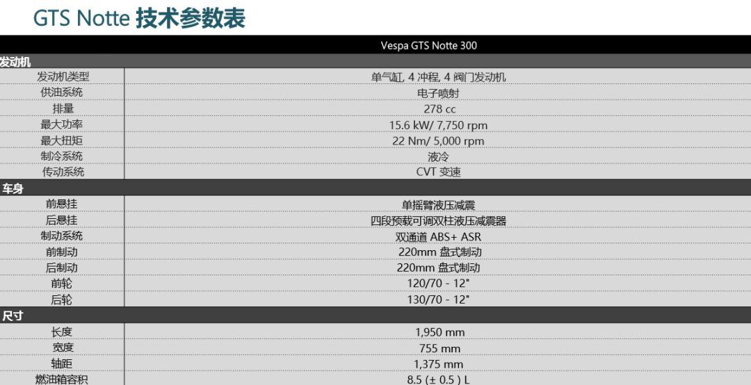 Vespa GTS Notte 300 搭載高科技單缸278cc四沖程發(fā)動機,采用水冷散熱以及高效四氣門結(jié)構(gòu)。最大功率可達(dá)15.6kW/7500rpm,最大扭矩為22N·m/5000rpm。在較低的轉(zhuǎn)速區(qū)間內(nèi),GTS Notte 300 即可獲得很好的加速體驗,配合一體式鋼板車架,營造舒適愜意的騎行體驗。無論是應(yīng)對城市通勤,又或是戶外郊游,Vespa GTS Notte 300 都能在應(yīng)對自如的同時,給予你更優(yōu)越的個性化騎行體驗。