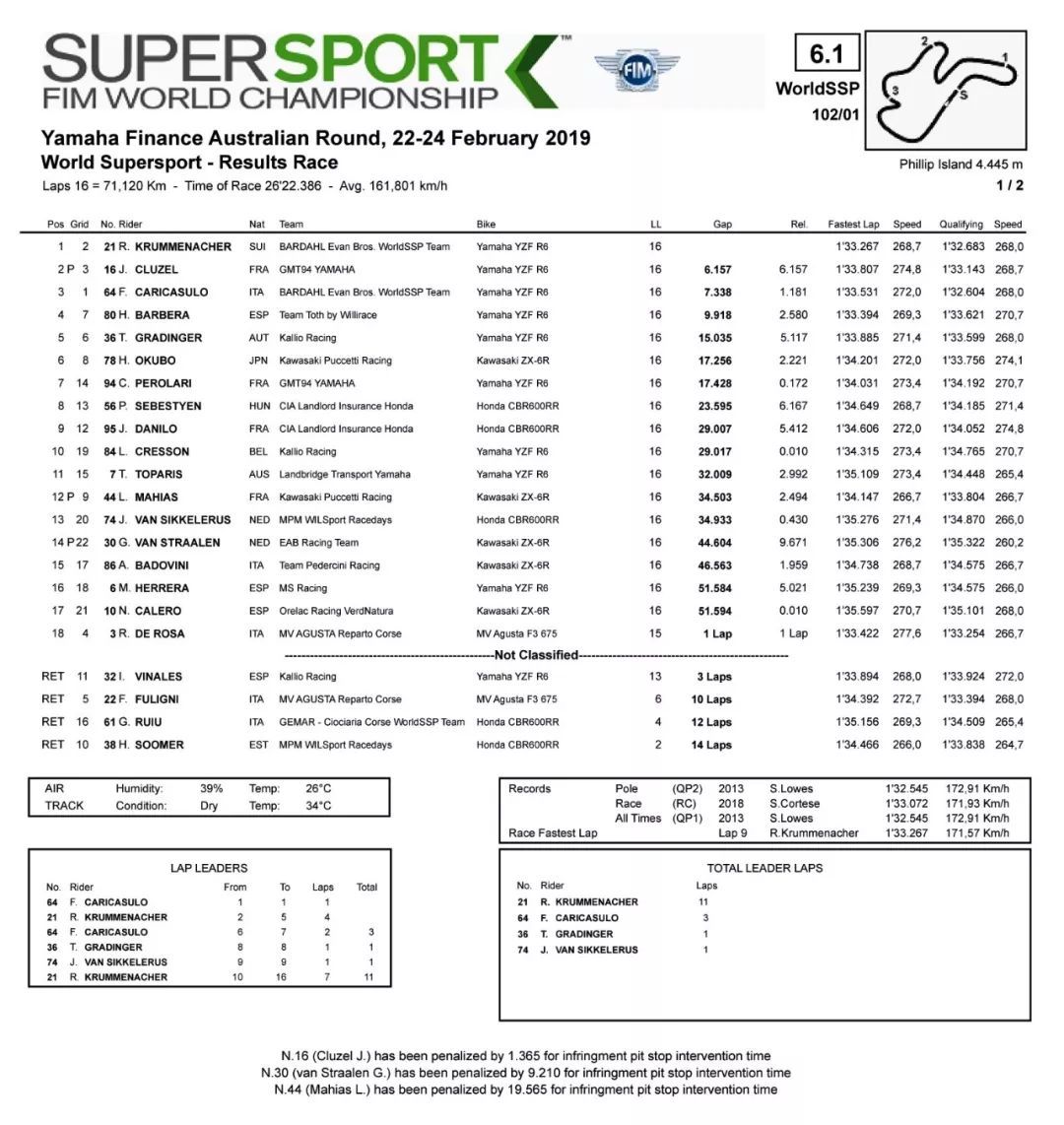 這場(chǎng) WSSP 600 的揭幕賽、前五名都被三支 Yamaha 工廠車隊(duì)包辦。最接近 Yamaha 集團(tuán)的是 78 號(hào)車、Kawasaki 的大久保光,他拿下了第六名。大久保光的隊(duì)友、駕駛 44 號(hào)車的法國(guó)車手馬希亞斯(Lucas Mahias)盡管跑在前面,但因?yàn)檫M(jìn)站換胎的時(shí)候、在維修區(qū)超速被罰 19.565 秒,最終他獲得了第十二位。