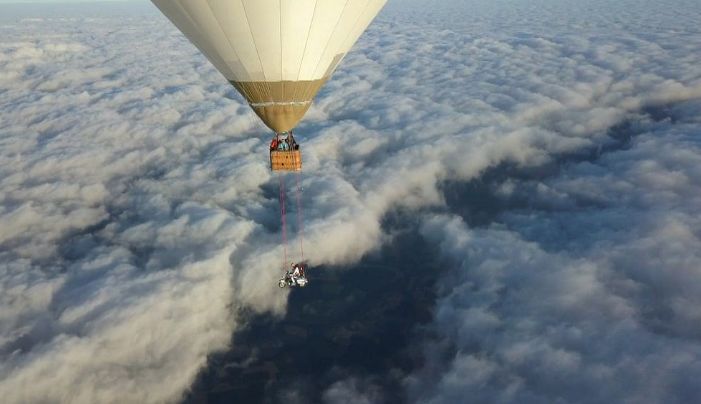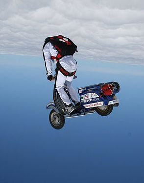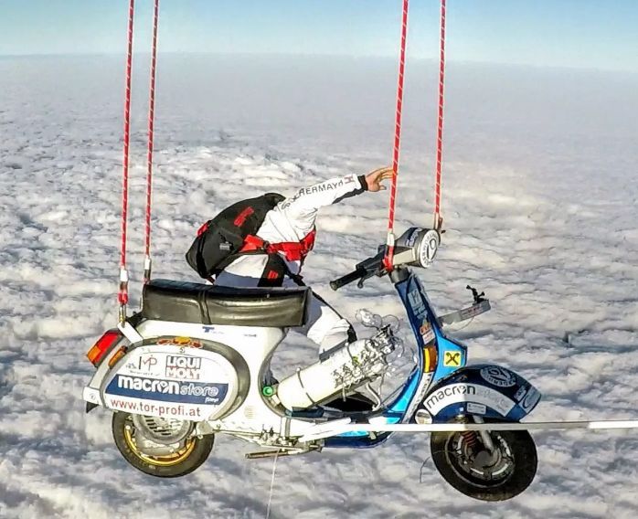 然而這些還不算什么,Günter Schachermayr對(duì)高空挑戰(zhàn)也有濃厚的興趣,之前他曾經(jīng)騎在VEPSA上,被熱氣球吊到4000米高空,騎著VESPA飄在云層之上感覺一定很棒吧。然后他就跳了下去......