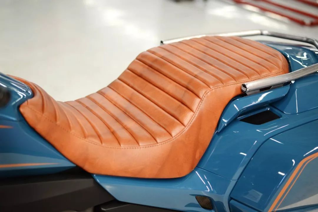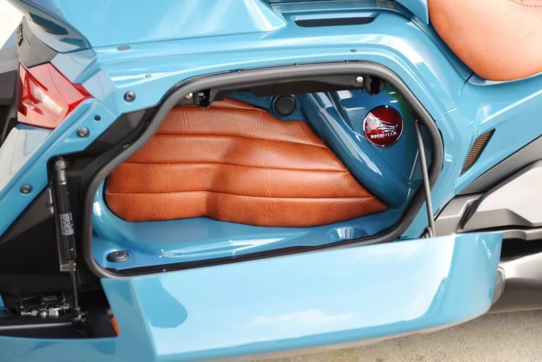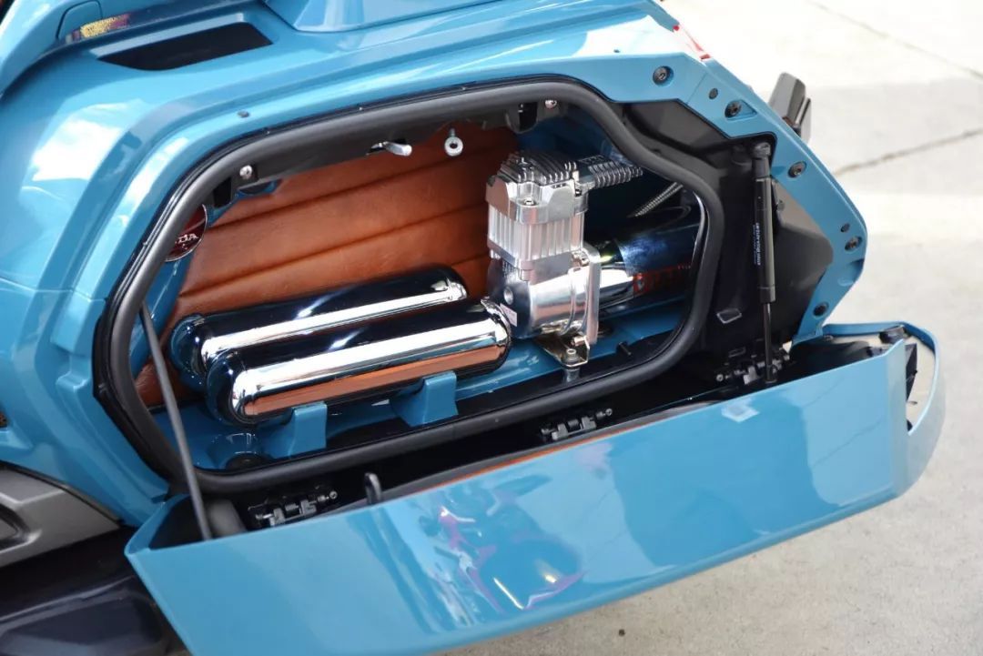 這臺(tái) Cool Wing“ 酷翼 ”,設(shè)計(jì)思路是既要代表他們對(duì)現(xiàn)代風(fēng)格的熱愛(ài),同時(shí)又可以向 Honda 這款旗艦級(jí)車(chē)型的輝煌傳統(tǒng)致敬。核心的挑戰(zhàn)、是要?jiǎng)?chuàng)造出一種時(shí)尚但又不會(huì)偏離功能太遠(yuǎn)的東西。最終作品的亮點(diǎn)部分,有空氣懸掛系統(tǒng),以高級(jí)皮革特制的鞍座,由當(dāng)?shù)亻_(kāi)發(fā)公司 Cub Group 制作的、業(yè)界首創(chuàng)的摩托車(chē)盲點(diǎn)監(jiān)控系統(tǒng)(BSM,Blind-Spot Monitoring),啞光的排汽管等。