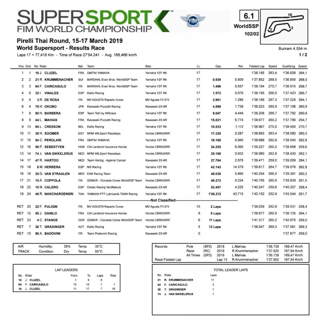 最終,克魯澤奪得泰國(guó)站 WSSP 600 級(jí)別的冠軍,克魯梅納切、卡里卡蘇洛分別獲得了第二、第三,繼揭幕戰(zhàn)的澳大利亞站之后,Yamaha 的車手再一次壟斷了頒獎(jiǎng)臺(tái)。
