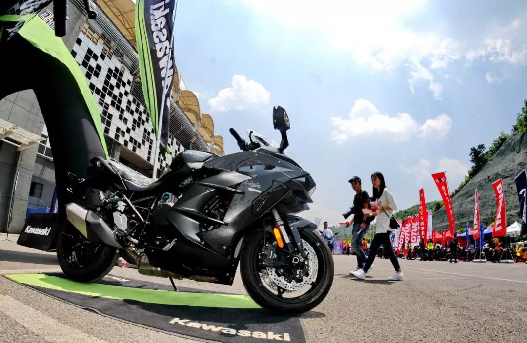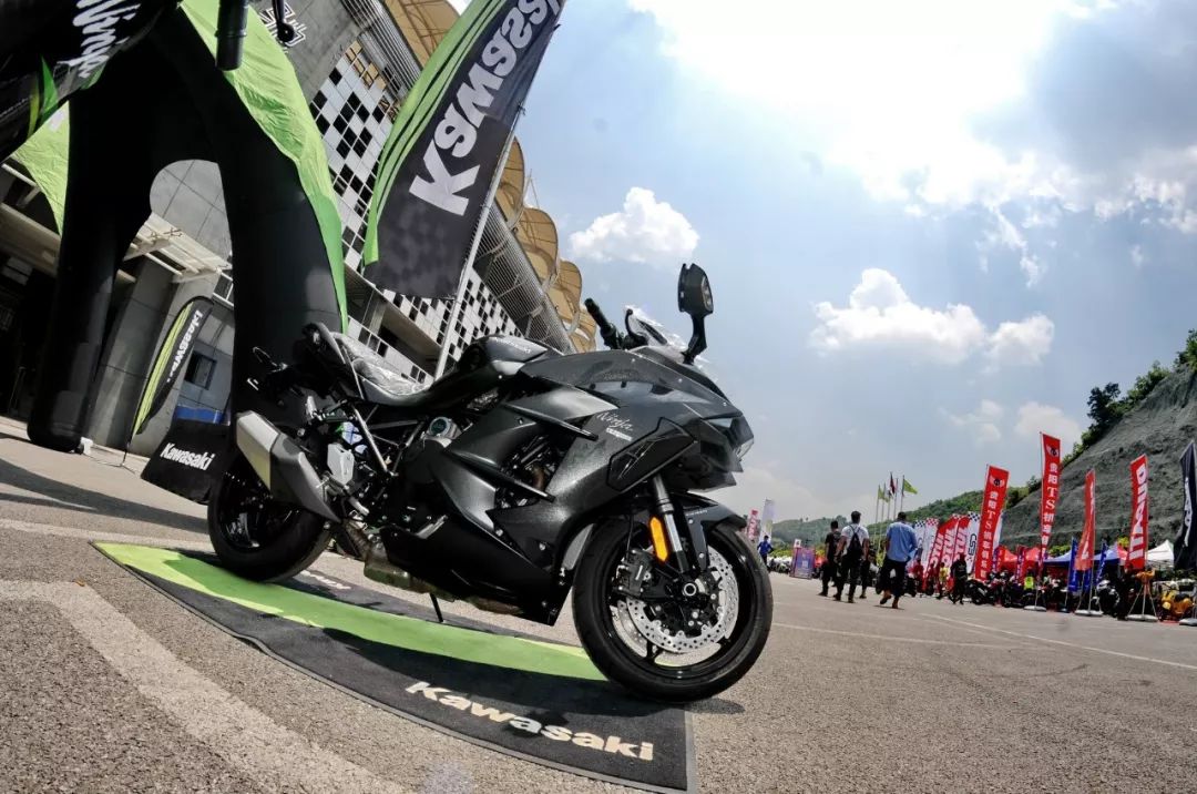 賽車場(chǎng)的跑道入口前、Kawasaki 的展位邊,配備了機(jī)械增壓發(fā)動(dòng)機(jī)的 H2 被放到了一個(gè)顯眼的位置上。