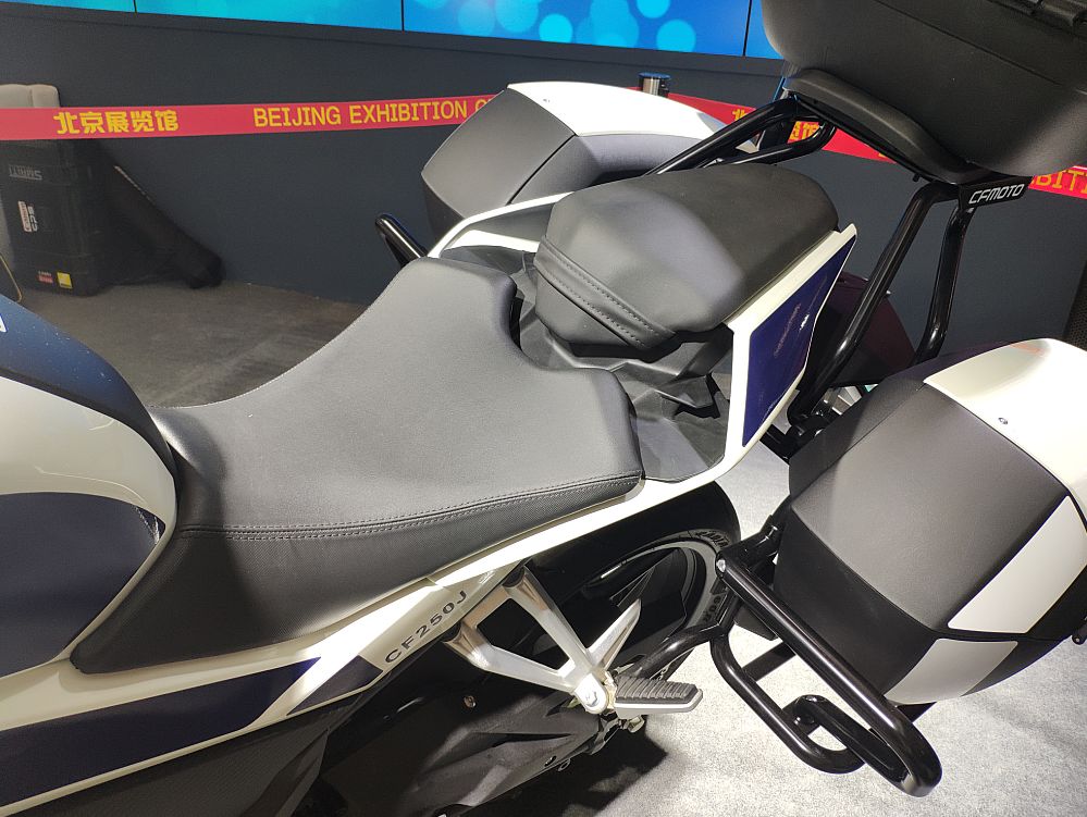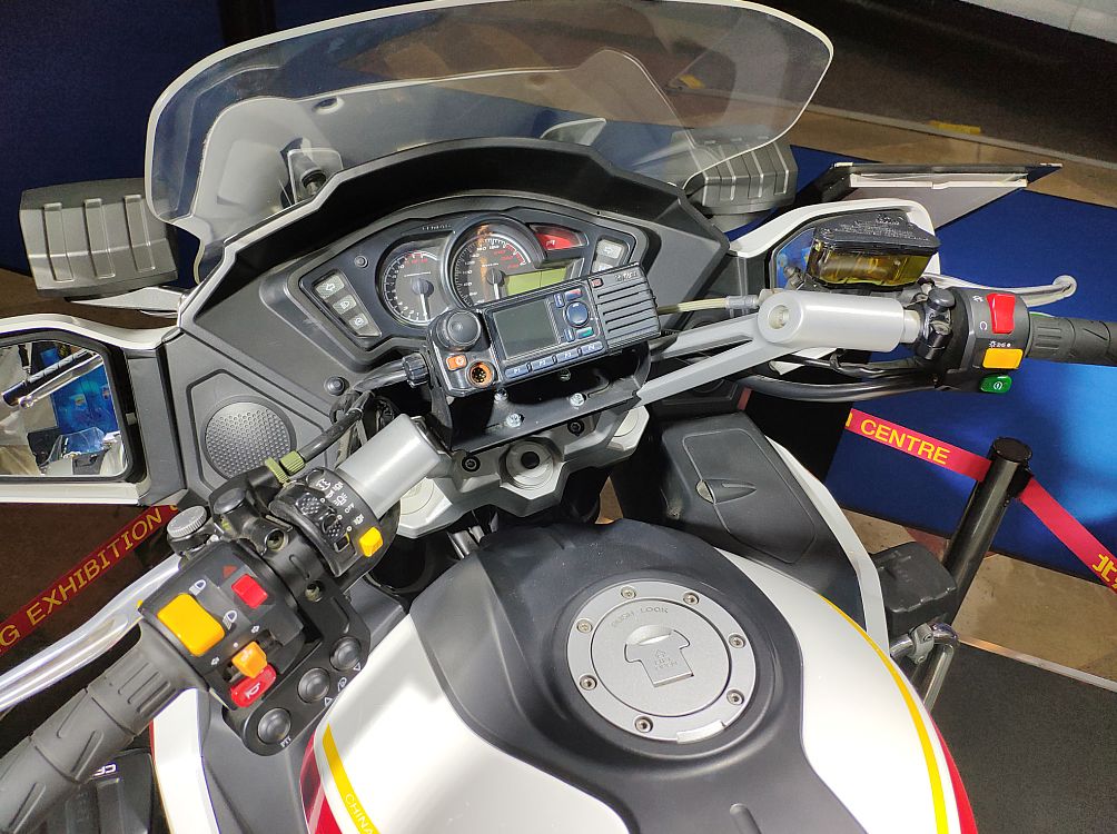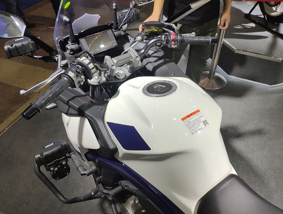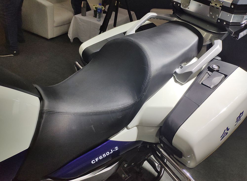 最引人注目的當然是中國武警北京總隊國賓護衛(wèi)隊的專用摩托車——春風650G國賓車。先來說說CF650G國賓車與我們熟悉的民用版有哪些主要區(qū)別吧。霸氣十足的紅白涂裝、燈具和威嚴的國徽肯定是第一眼就能發(fā)現(xiàn)的。車把搭載的互聯(lián)通訊設備,通過移動信號的傳輸,可以實現(xiàn)集群全雙功通話和北斗定位功能,車頭處裝備的高清攝像頭可通過移動信號實時回傳到指揮中心,為統(tǒng)一指揮和調(diào)控提供便利。另外坐墊也是一大亮點,這可不是普通的坐墊,內(nèi)置了春風創(chuàng)新專利“內(nèi)置氣囊可升降調(diào)節(jié)”技術(shù),可根據(jù)護衛(wèi)隊員們的身高和駕駛習慣讓座高在780mm-810mm的范圍內(nèi)進行調(diào)節(jié),提供更理想的駕駛感受?;蛟S有眼尖的朋友發(fā)現(xiàn)了國賓車為什么沒有采用新款民用版上的大液晶儀表,這是因為CF650G國賓車的公告在2014年時就已經(jīng)確定,作為特種車輛是不能隨意更改參數(shù)配置的,那么國賓車就不能享受到配置的更新了嗎?別著急,我們先賣個關子,一會再說這個......