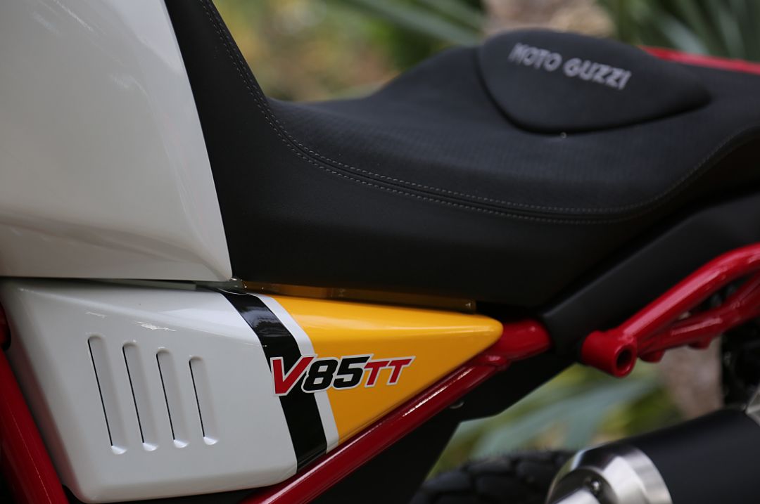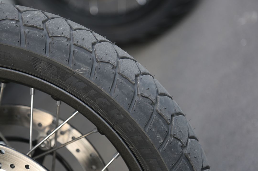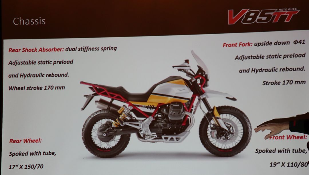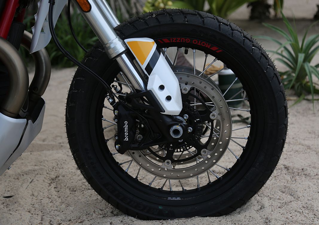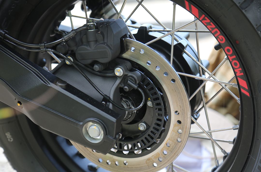 V85 TT前制動采用320mm的雙浮動盤配Brembo對向四活塞卡鉗,后260mm單盤配雙活塞卡鉗,提供了充足的制動力保障。同時配有Continental雙通道ABS系統(tǒng),并連接電控系統(tǒng),匹配不同的騎行模式,例如在越野騎行模式下,后輪ABS將被關(guān)閉,同時前輪ABS會延后介入時機(jī),滿足地抓地力表面的制動需求。V85 TT使用了耐沖擊的輻條式輪轂,同時保留了內(nèi)胎,這樣可以在輪胎被刺穿時更加容易修復(fù)。根據(jù)版本的不同,輪胎有米其林全地形胎(雙色板)和象牌旅行胎(標(biāo)準(zhǔn)版)兩種,輪胎規(guī)格前110/80 R19,后150/70 R17。另外兩個版本還在車架顏色、坐墊材質(zhì)等方面有所區(qū)別。