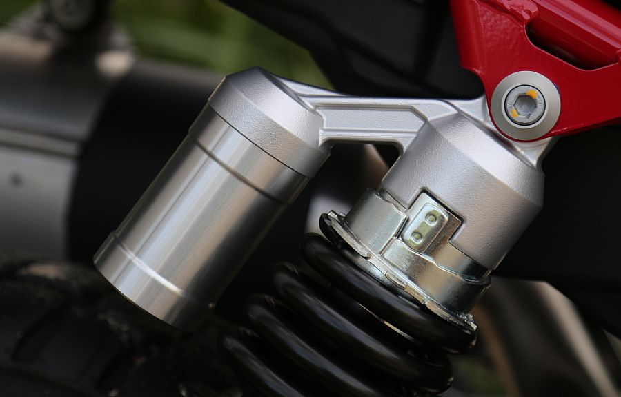 減震系統(tǒng)方面,V85 TT采用了41mm全可調(diào)倒立式前減震,前減震頂部中間的螺絲可控制回彈阻尼,下方的六角形螺蓋可調(diào)節(jié)彈簧預(yù)載阻尼,減震行程為170mm,在前減震的下方配有塑料擋板,以抵擋灰塵和砂石。同樣支持預(yù)載和回彈阻尼可調(diào)的后側(cè)置單減震被固定在右側(cè)的傳動軸搖臂上,減輕荷重的同時更加方便進(jìn)行調(diào)節(jié),后減震的減震行程同樣為170mm。由于發(fā)動機(jī)成為了車架的一部分,省略的底部車架部分讓V85 TT的最小離地間隙達(dá)到210mm,這樣的高度非常能體現(xiàn)出V85 TT的態(tài)度,也讓非鋪裝路面的騎行更加輕松。